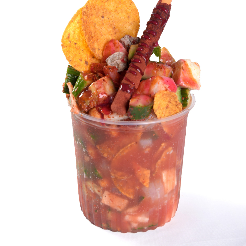 A la mitad del vaso con clamato, chile en polvo, limon, sal de apio y saladito.