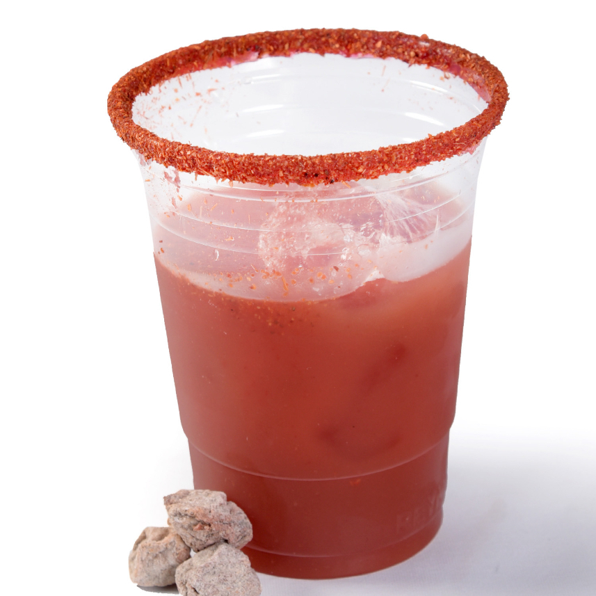 Clamato, chile en polvo, limon, sal de apio, salsa inglesa, salsa tabasco y saladito.