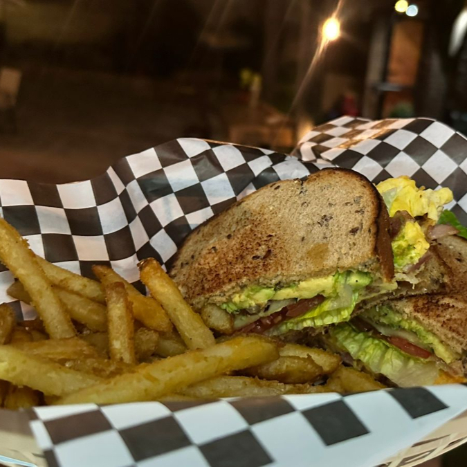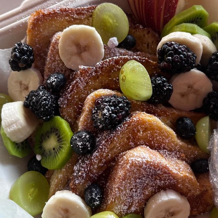 Pan brioche acompañado de tocino y fruta de temporada