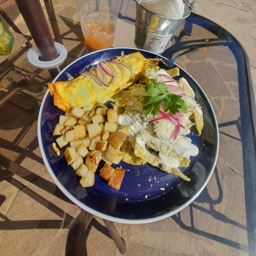 omelette con porcion de chilaquiles rojos y verdes con papas y frijoles refritos