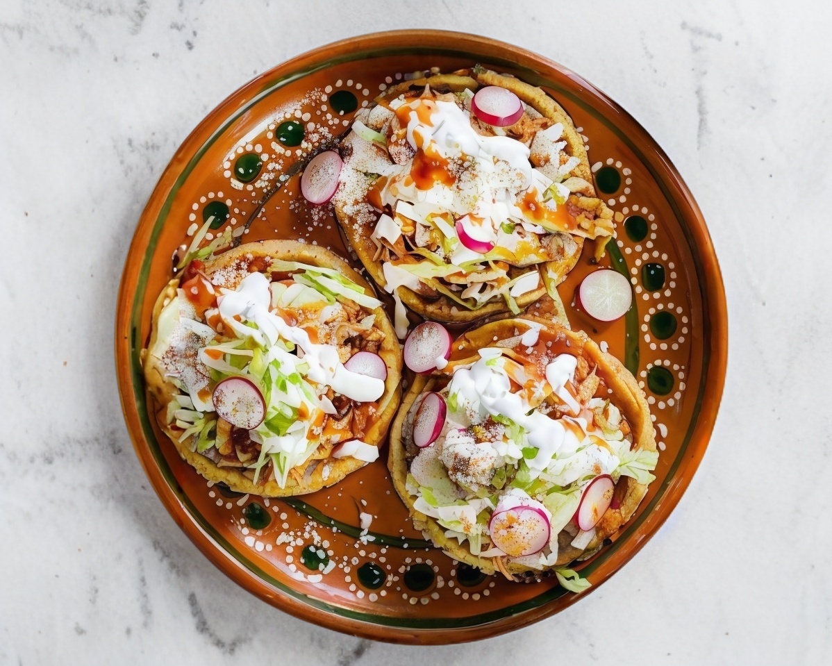 Sopes de masa de nixtamal, rellenos de picadillo, con crema, lechuga, queso cotija, cebolla morada y aguacate