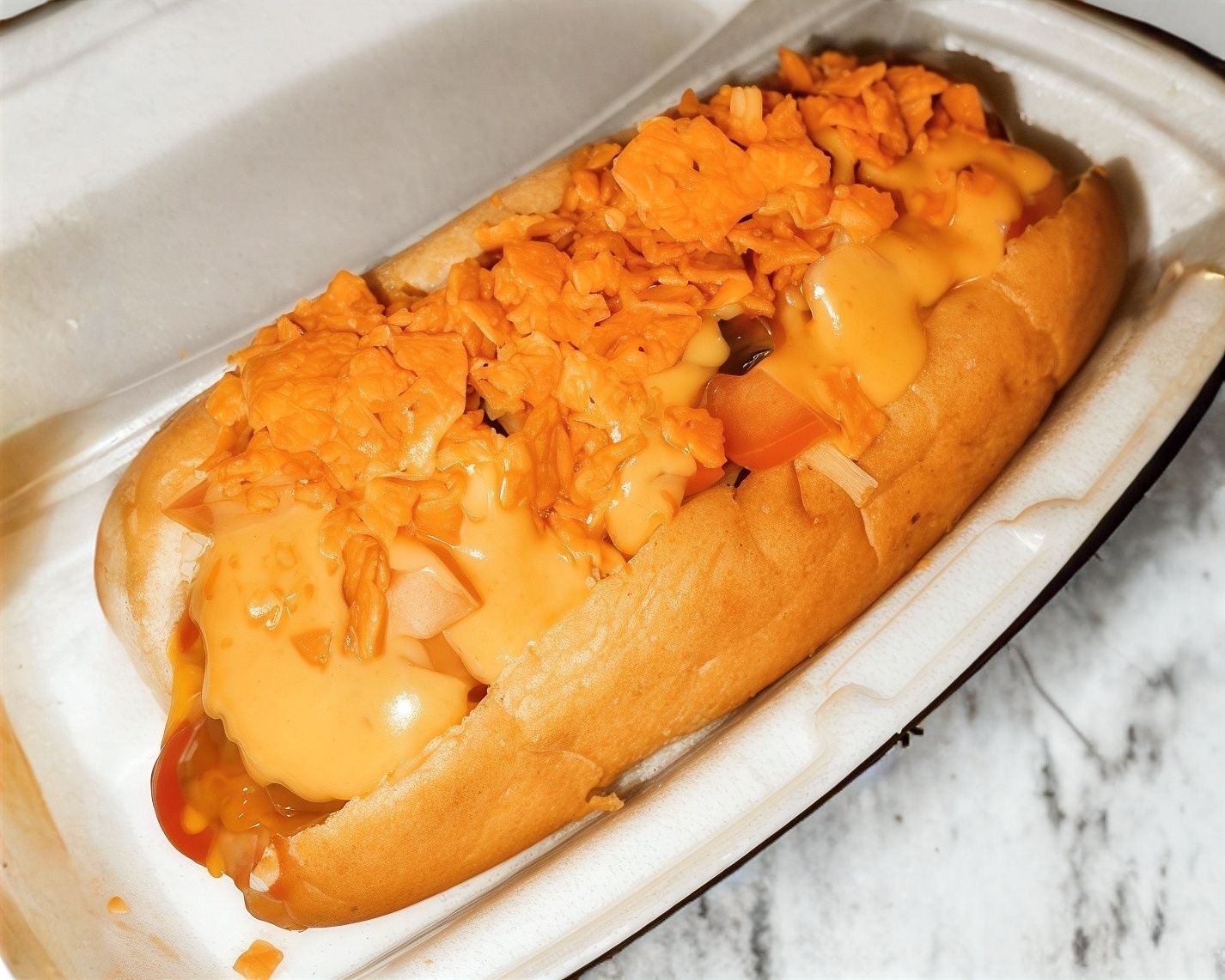 Pan artesanal, mayonesa, mostaza, tomate, cebbolla, salsa de tomate, salchicha vegana, aceitunas negras, champiñones, queso de nachos, crema y papitas.