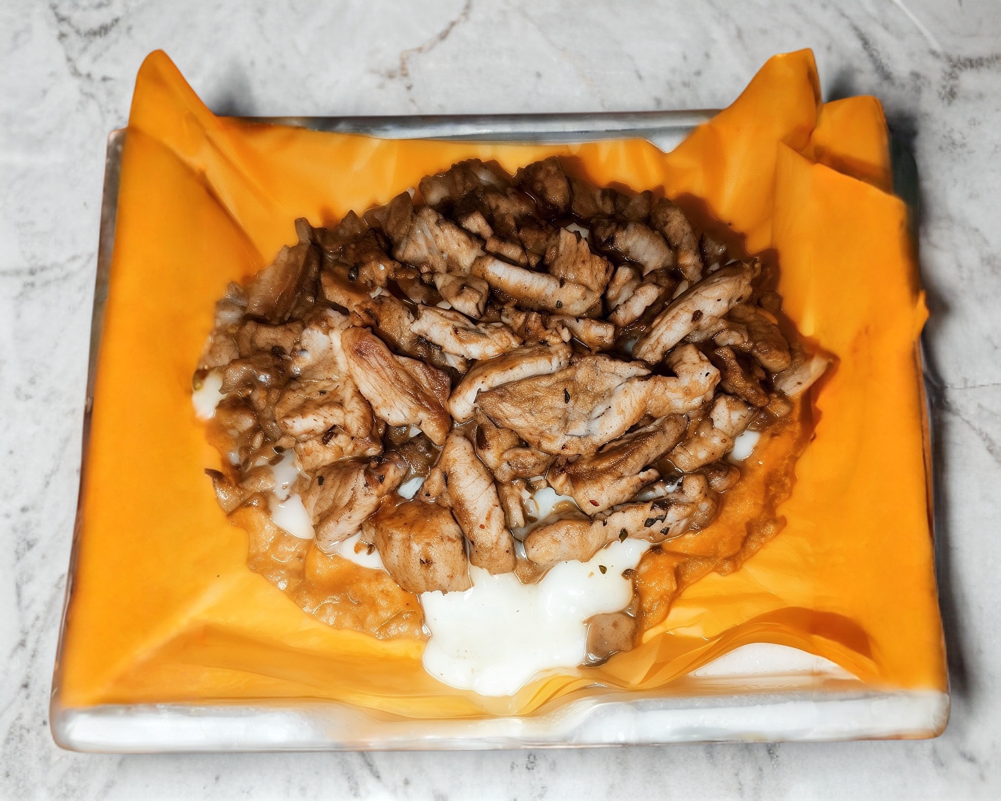 Pan Artesanal de masa madre con mantequilla a la plancha y 150gr de Lomo de cerdo a cocción lenta y sazonado.