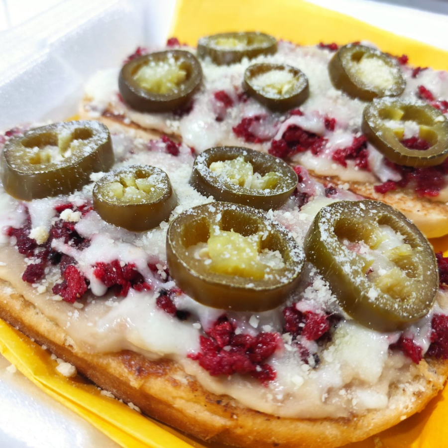 2 Pan Artesanal estilo sonora, con mantequilla a la plancha, frijol de base, chorizo de res artesanal sazonado, queso mozzarella, cebolla y jalapeños en rodajas, gratinado al horno.