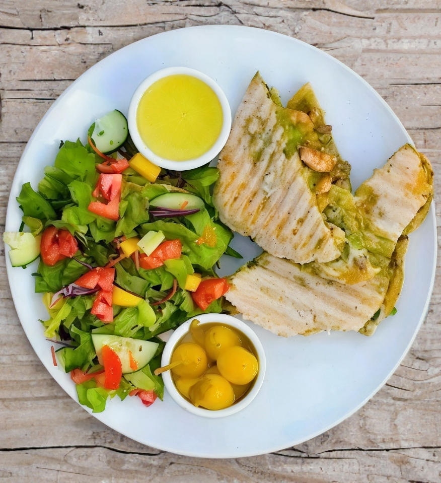 Pan ciabatta artesanal, pechuga de pollo a la plancha con pesto y queso gratinado.