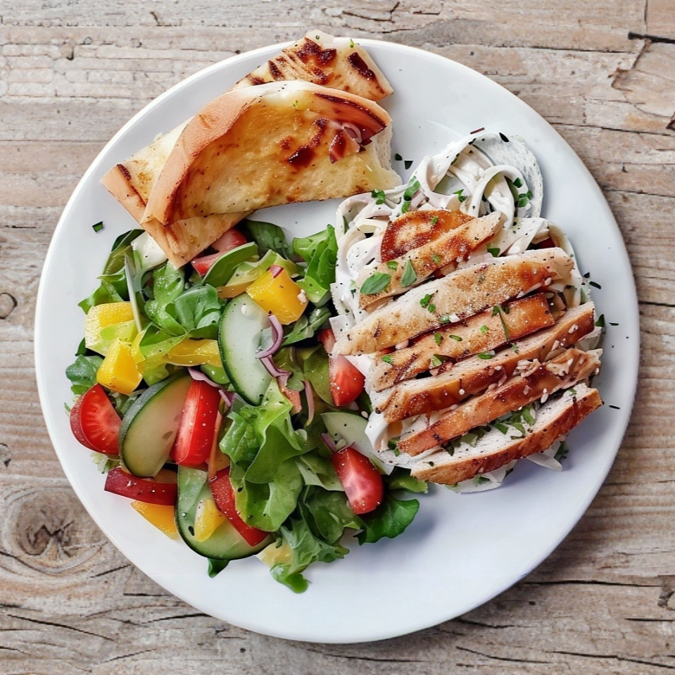 Fetuccine en crema Alfredo con pechuga de pollo a la plancha, acompañada de ensalada y pan preparado con mantequilla, ajo y romero.