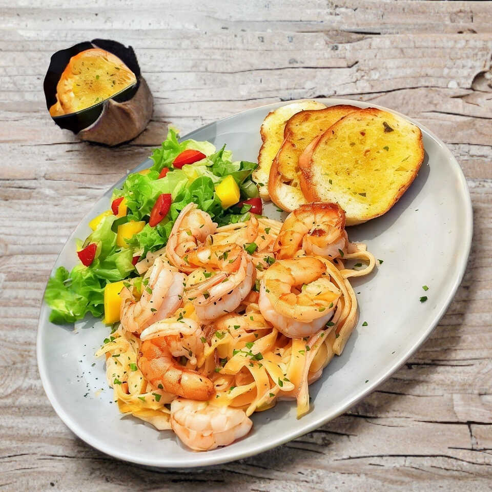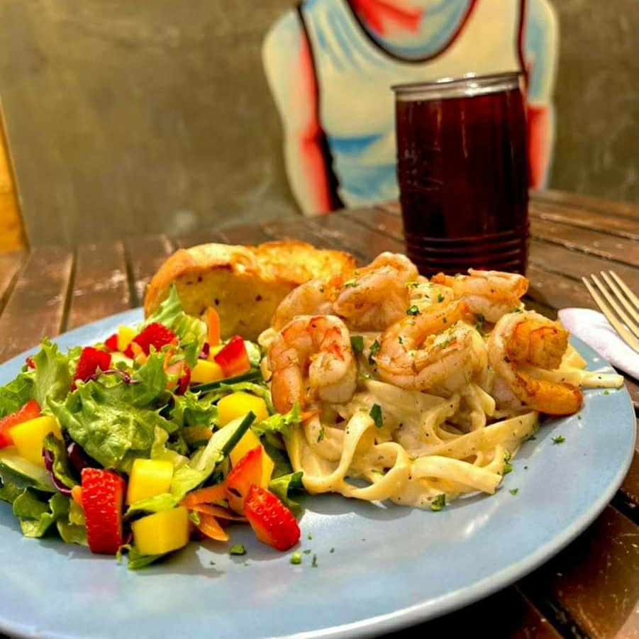 Fetuccini en crema alfredo con camarones acompañado de ensalada y pan.
