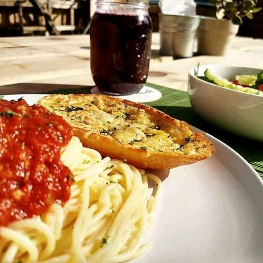 Pasta boloñesa acompañada de ensalada y pan preparado con mantequilla, ajo con romero.