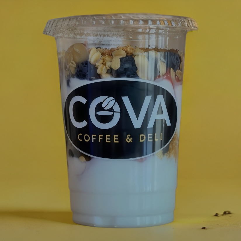 Vaso de yogurt griego natural con manzana, peras, platano, almendras y nuez