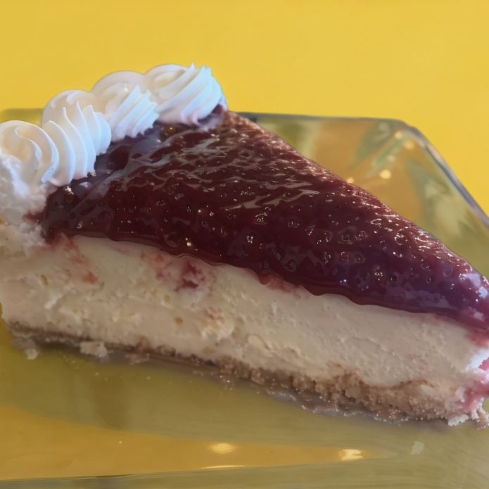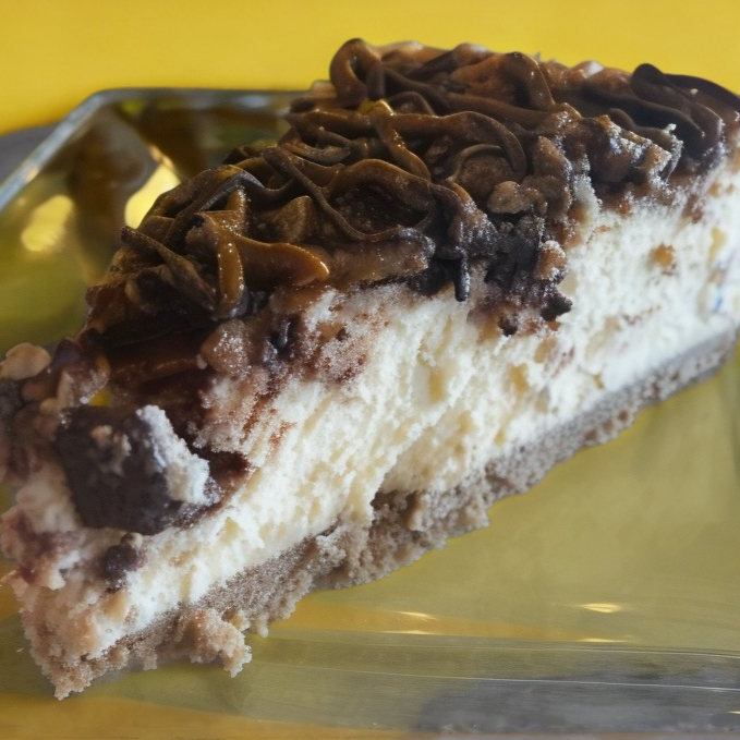 Rebanada de pay de queso con trozos de chocolate, cajeta y nuez