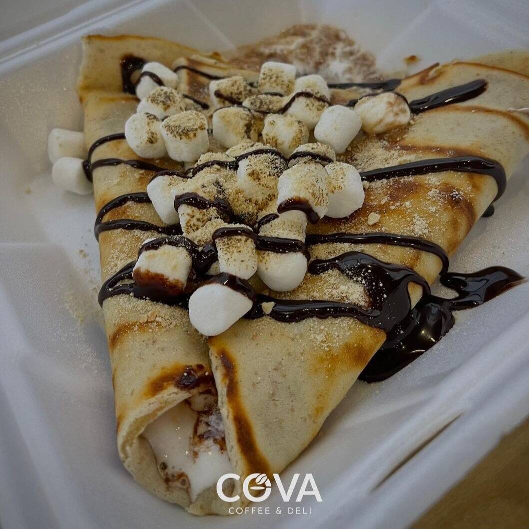 crepa con bombones flameados, chocolate liquido y galleta de vainilla