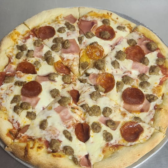 Salsa tomate, queso mozzarella, salami, pepperoni, jamón, tocino, salchicha italiana.