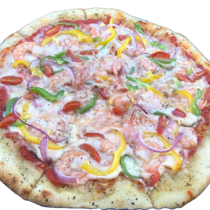 Camarones frescos, cebolla morada, pimientos, tomate cherry, queso mozzarella, mantequilla, ajo y especies, y salsa de tomate.