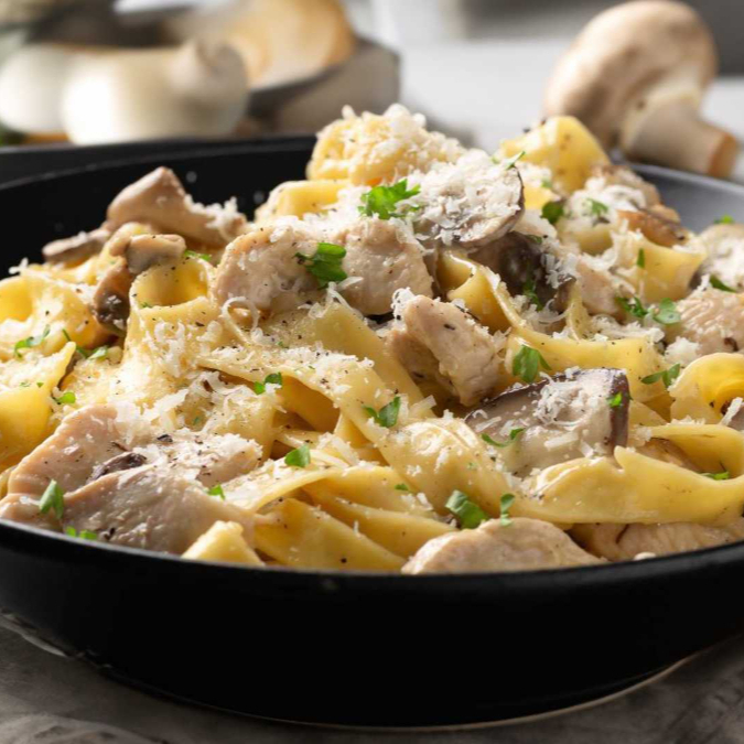“Cremosidad que abraza, sabor que conquista. Alfredo, pollo y champiñones: el clásico elevado.”