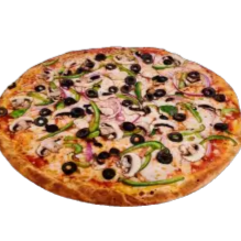 Aceituna negra, cebolla morada, champiñones, tomate cherry, queso y salsa de tomate.