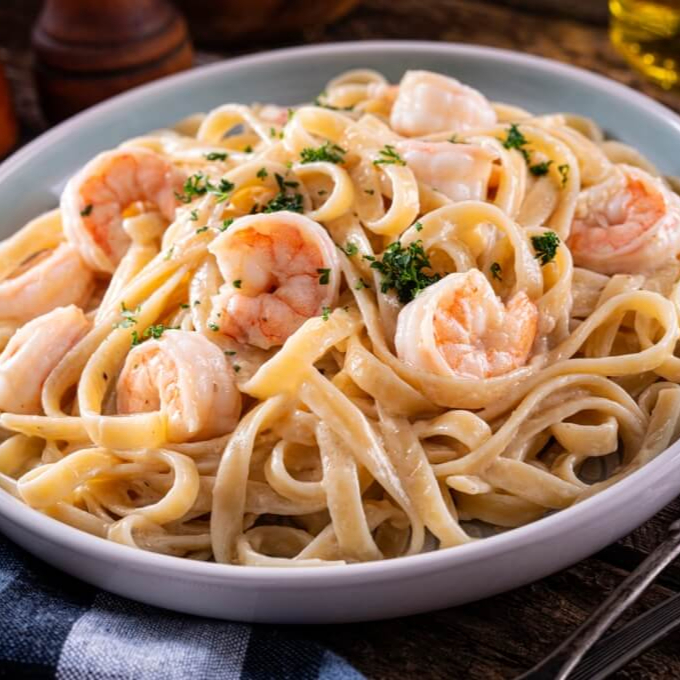 Pasta fresca en cremosa salsa Alfredo, acompañada de camarones salteados al punto. Un clásico elegante y lleno de sabor.