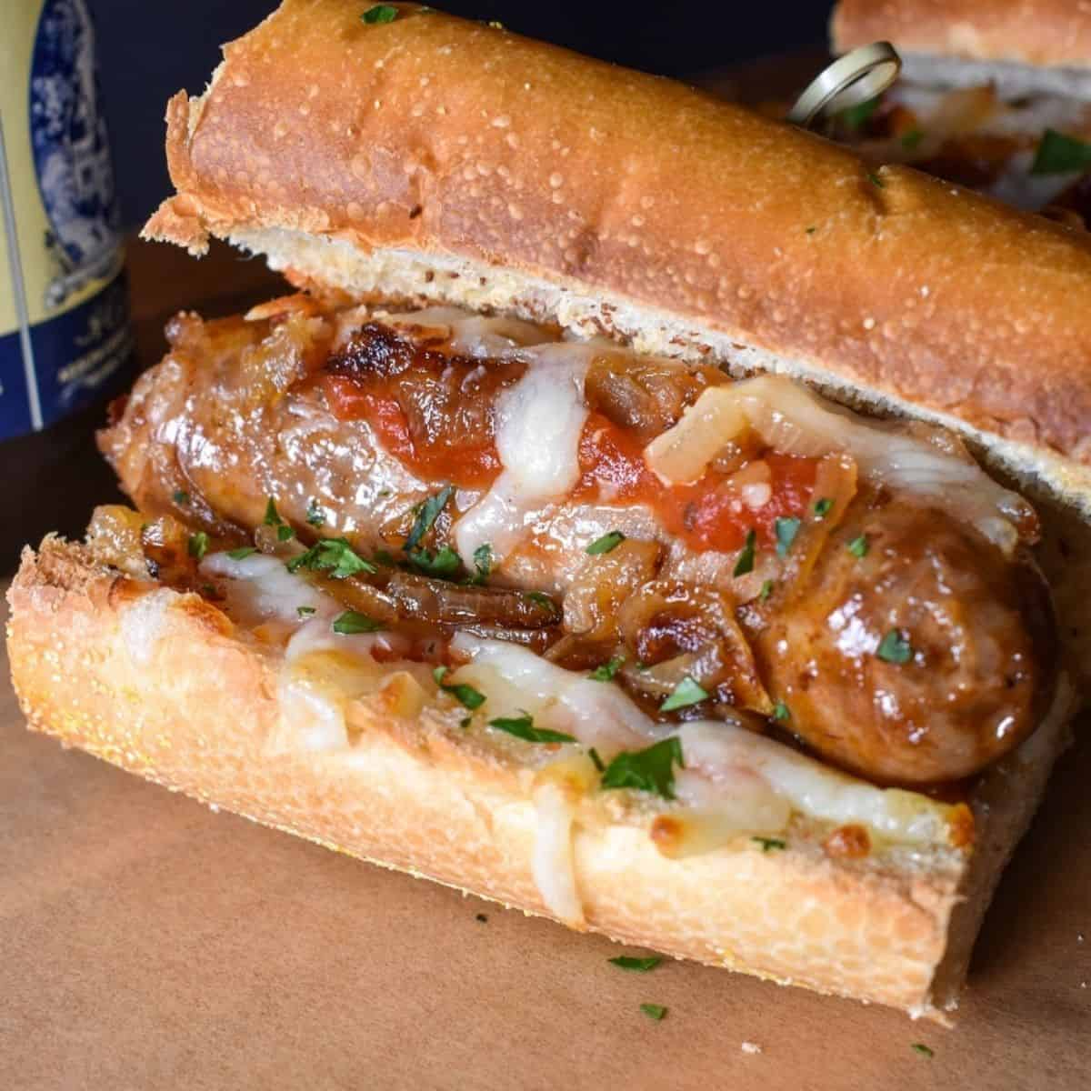 Salchicha Italiana, salsa de la casa, queso mozzarella, pimiento verde y cebolla caramelizada.