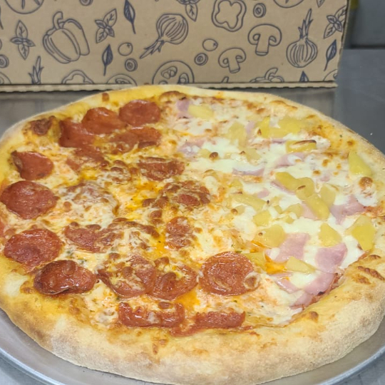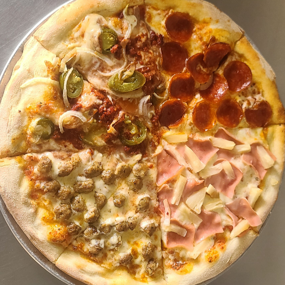 Elaborada con 2 rebanadas de 4 sabores diferentes. Pepperoni, mexicana, hawaiana, italiana, queso mozzarella y salsa de tomate.