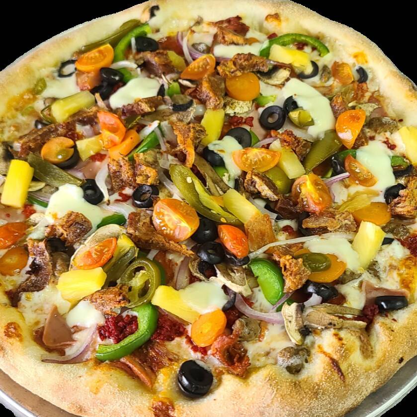 Pepperoni, jamón, salchicha italiana, pastor, tocino, chorizo, pastor, frijol, piña, jalapeños, aceituna, cebolla, champiñones, pimiento, queso mozzarella, queso parmesano. Una bomba de sabor.