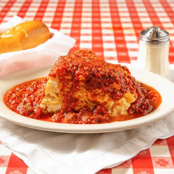 Una sinfonía de quesos y sabores, capas de queso, mozzarella, ricotta y parmesano, bañada con su salsa con carne y acompañada con sus ricos panes de ajo y mantequilla.