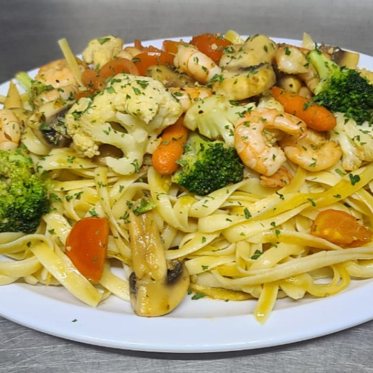 Camarones jugosos salteados con vegetales frescos, cebollín, tomate y ajo, realzados con limón, aceite de oliva y especias aromáticas, servidos sobre una delicada cama de fetuccini al dente, acompañado con pan de ajo y mantequilla.