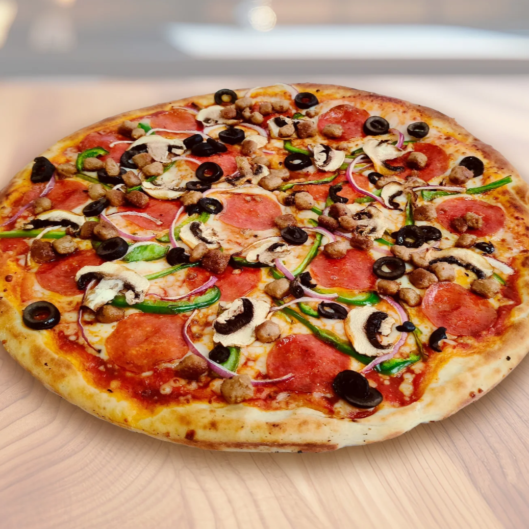 Salsa de tomate, queso mozzarella, pepperoni, jamón, salchicha italiana, pimiento verde, champiñones, cebolla morada, aceituna negra, tomate cherry.