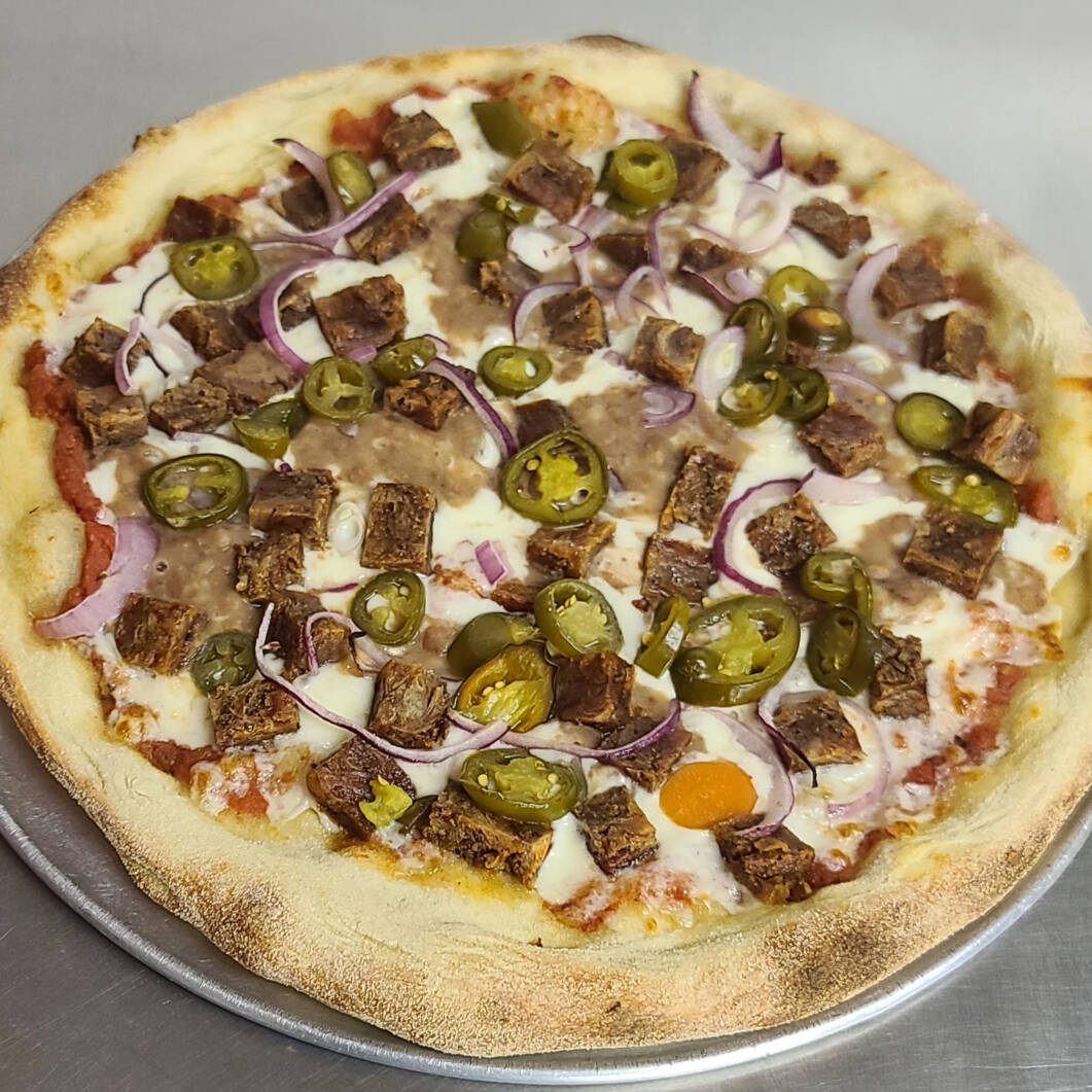 Salsa de tomate, queso mozzarella, chicharrón prensado, tocino, cebolla morada, jalapeños.