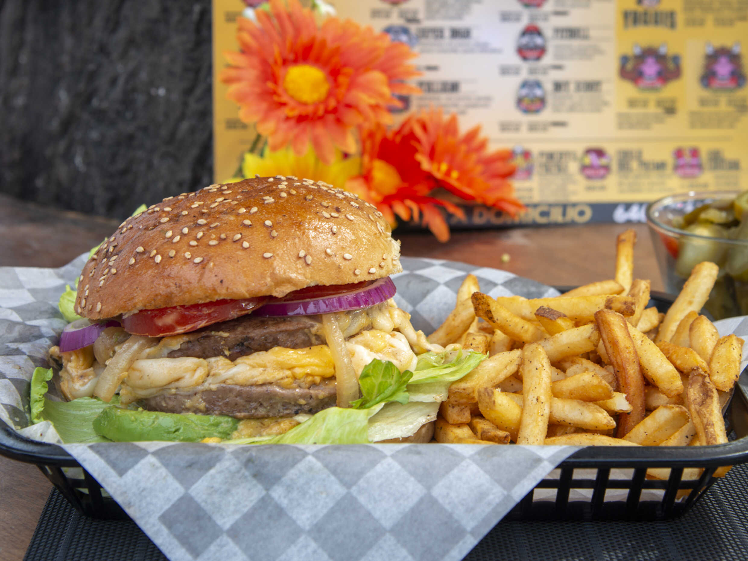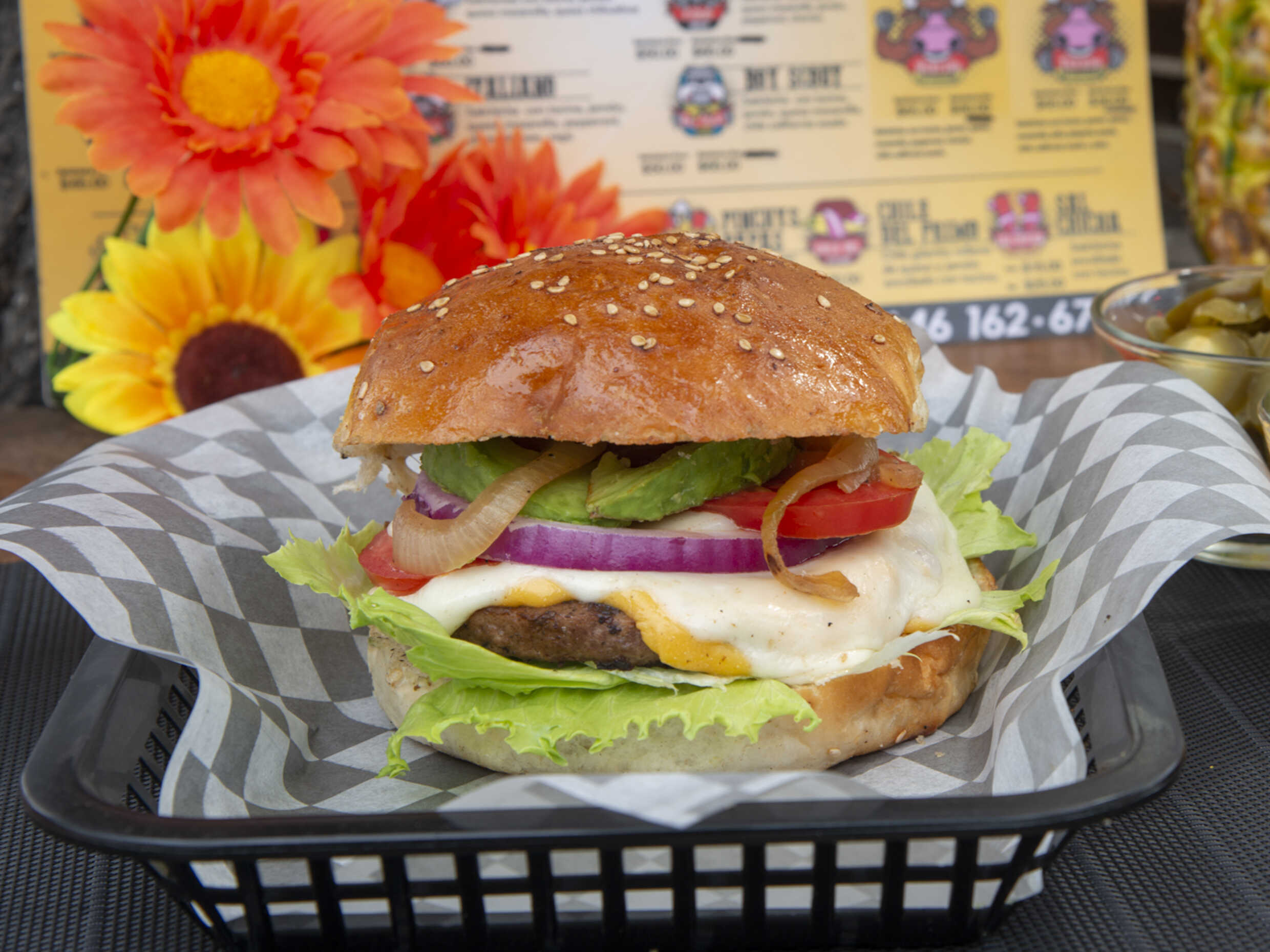 Doble carne 100% arrachera, queso mozzarella, queso amarillo, tomate, aguacate, cebolla cruda, lechuga, cebolla frita, mayonesa, mostaza, kétchup, chipotle.