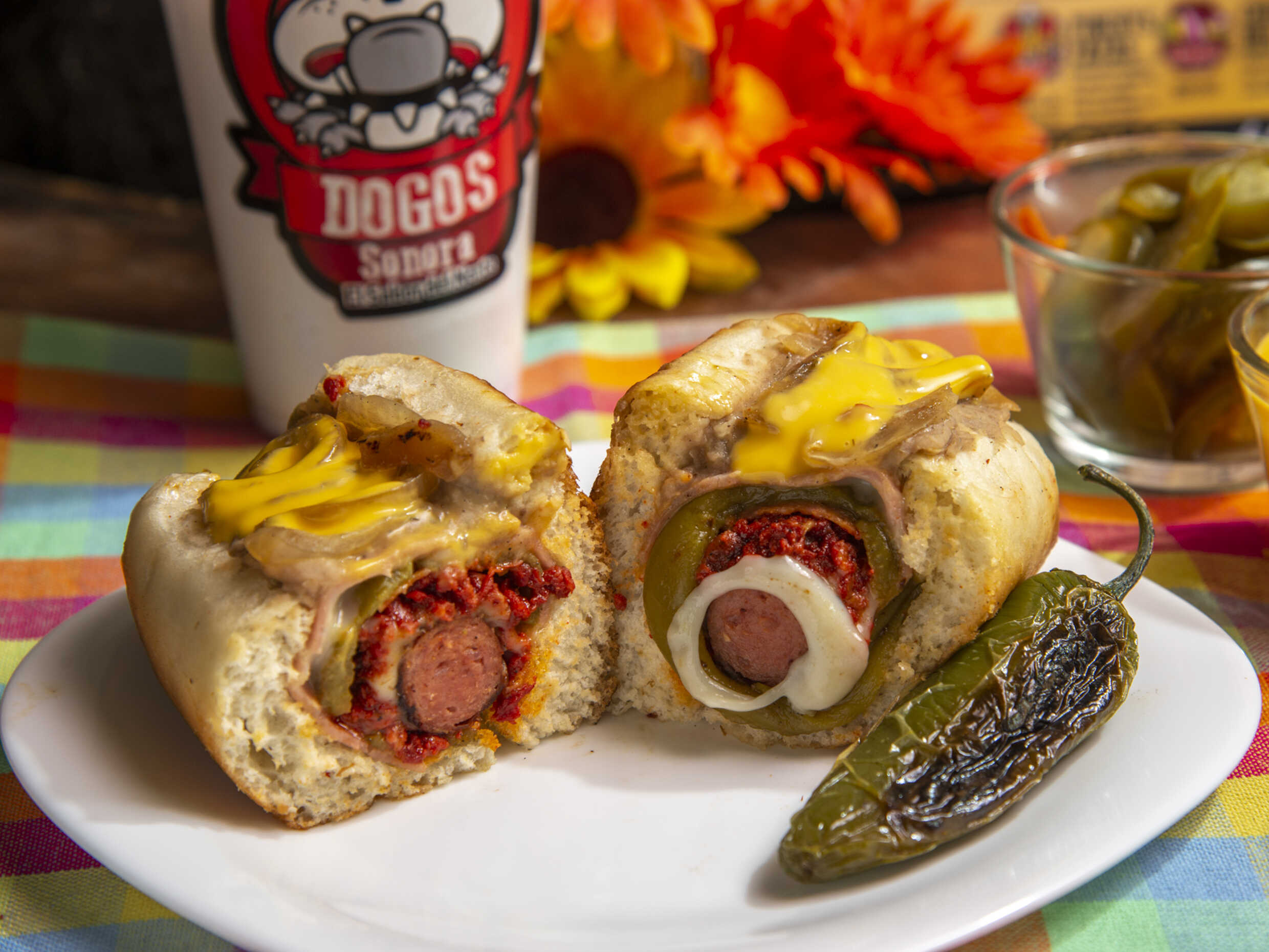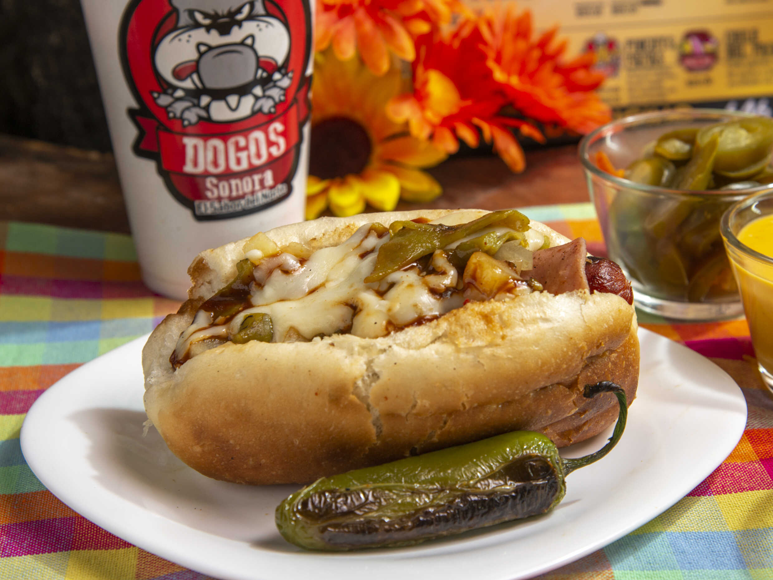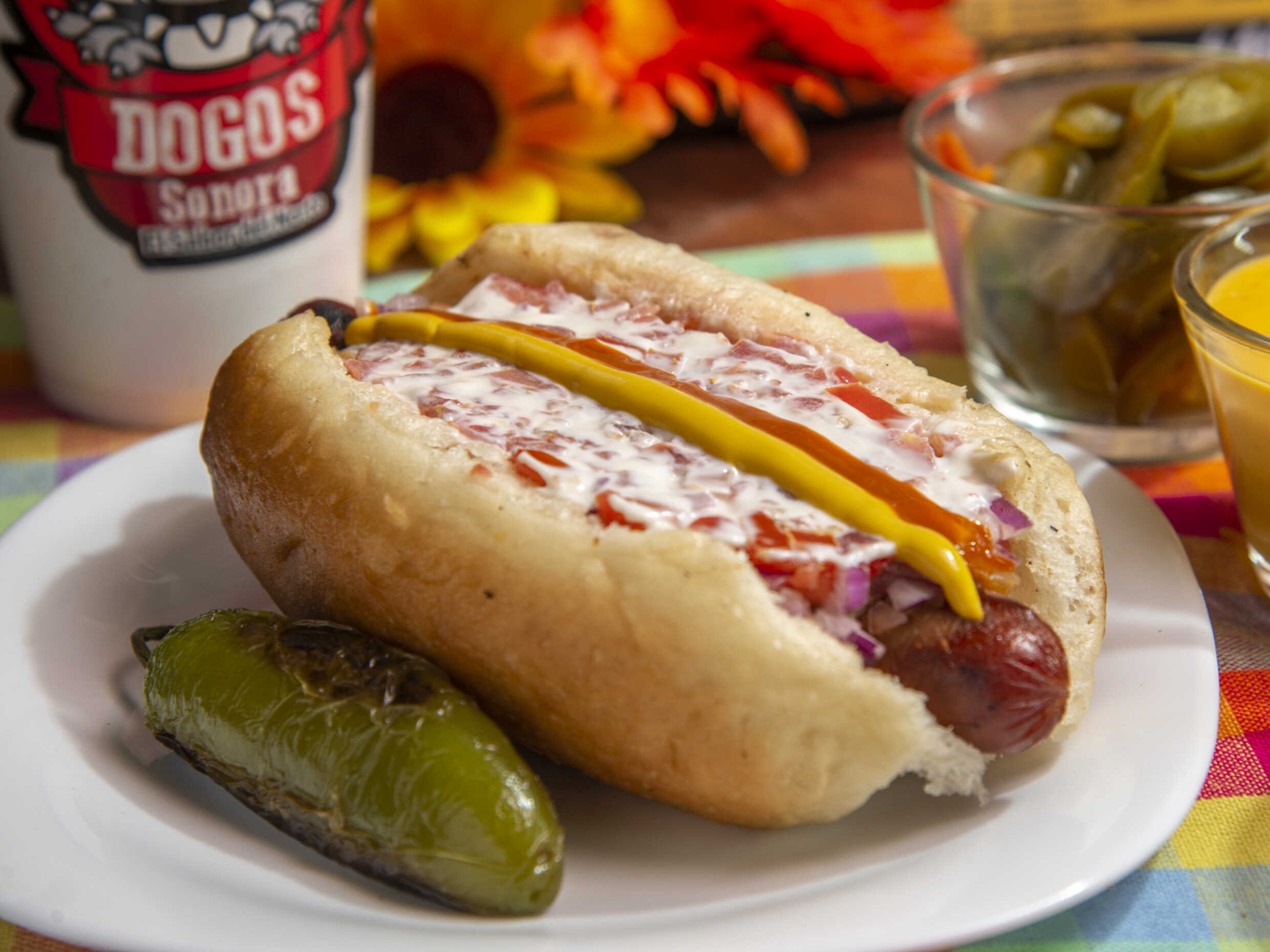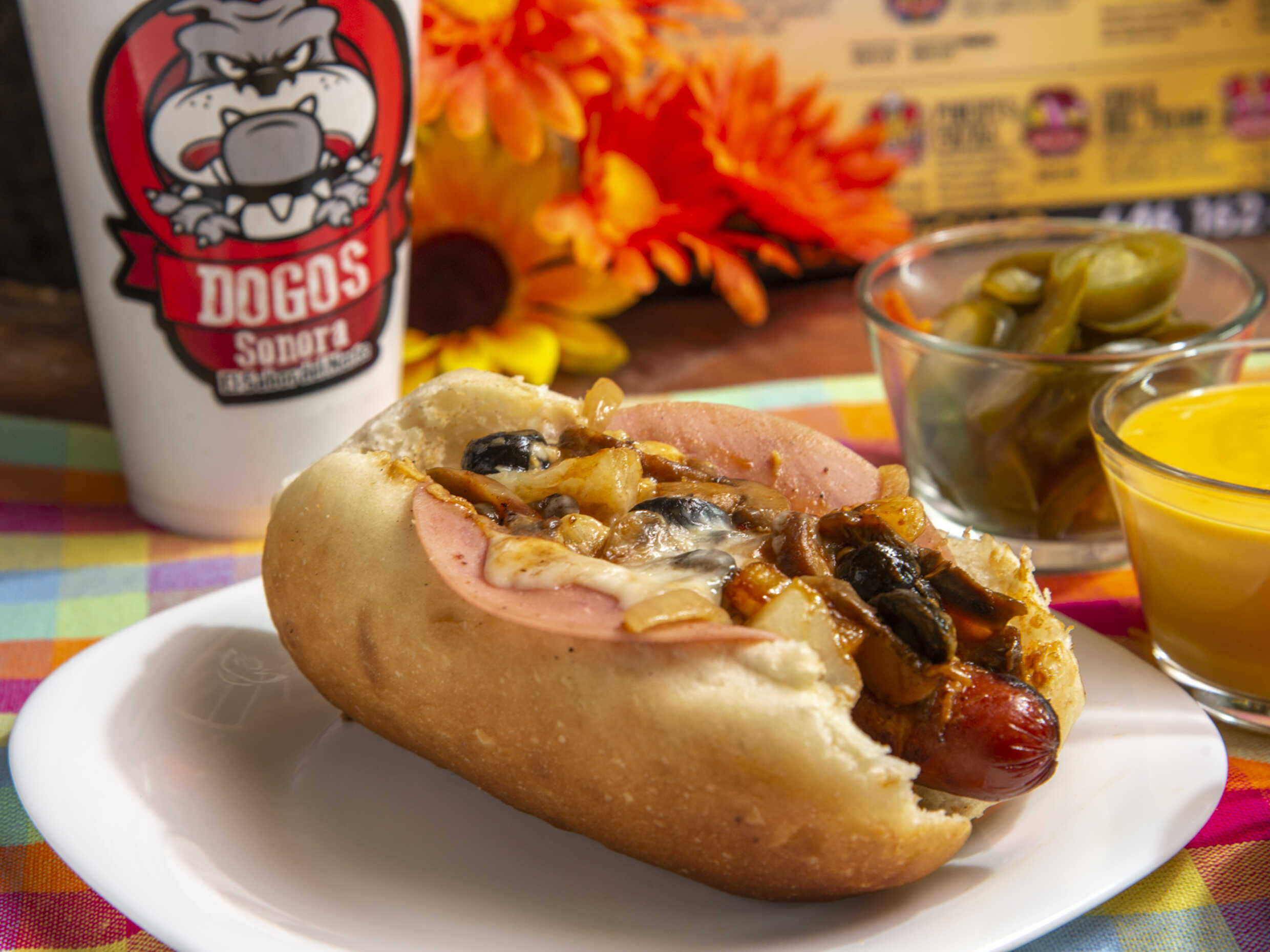 Cebolla frita, cebolla cruda, tomate, mayonesa, mostaza, salsa huichol y queso de nachos.