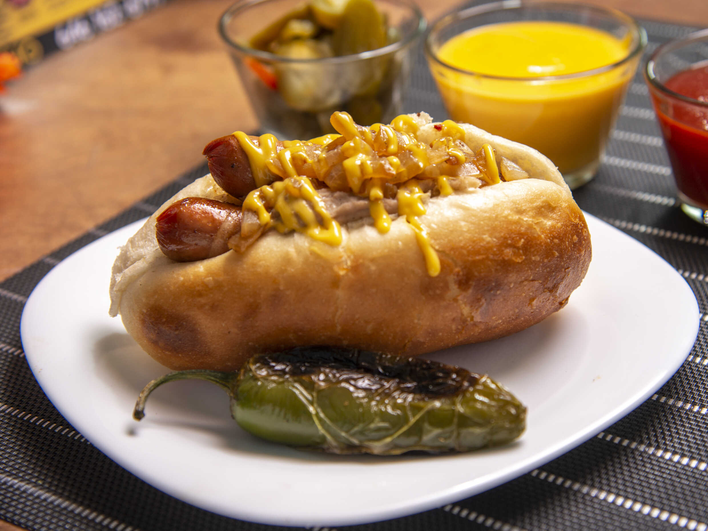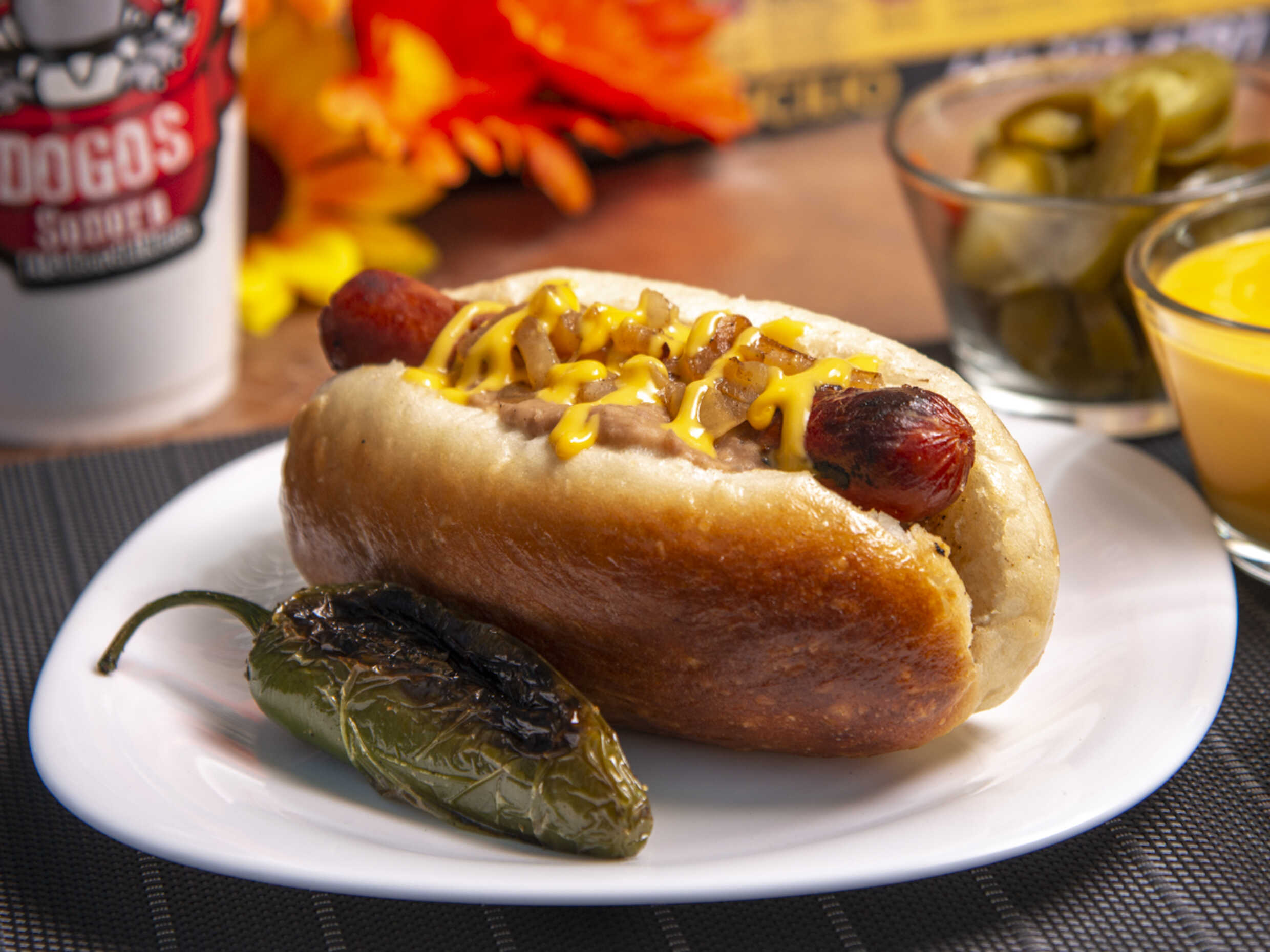 Dos salchichas con tocino, frijoles refritos, cebolla frita, queso de nachos.