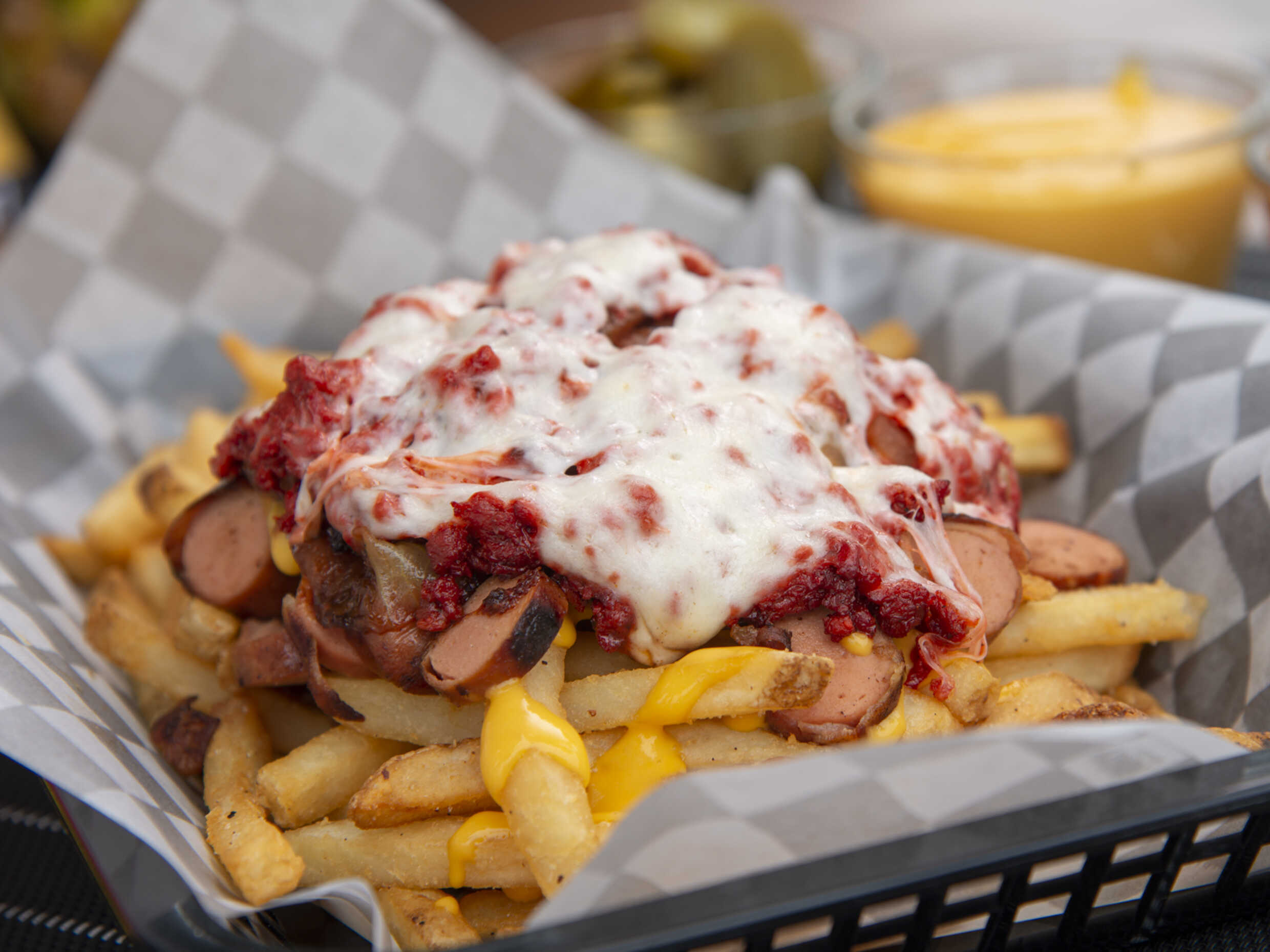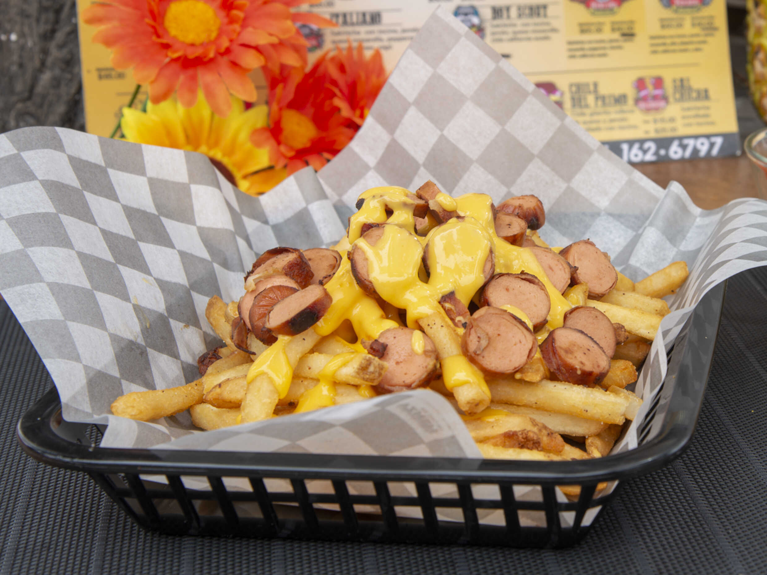 Papas fritas, queso de nachos, salchicha, chorizo, cebolla frita, gratinadas con queso mozzarella.
