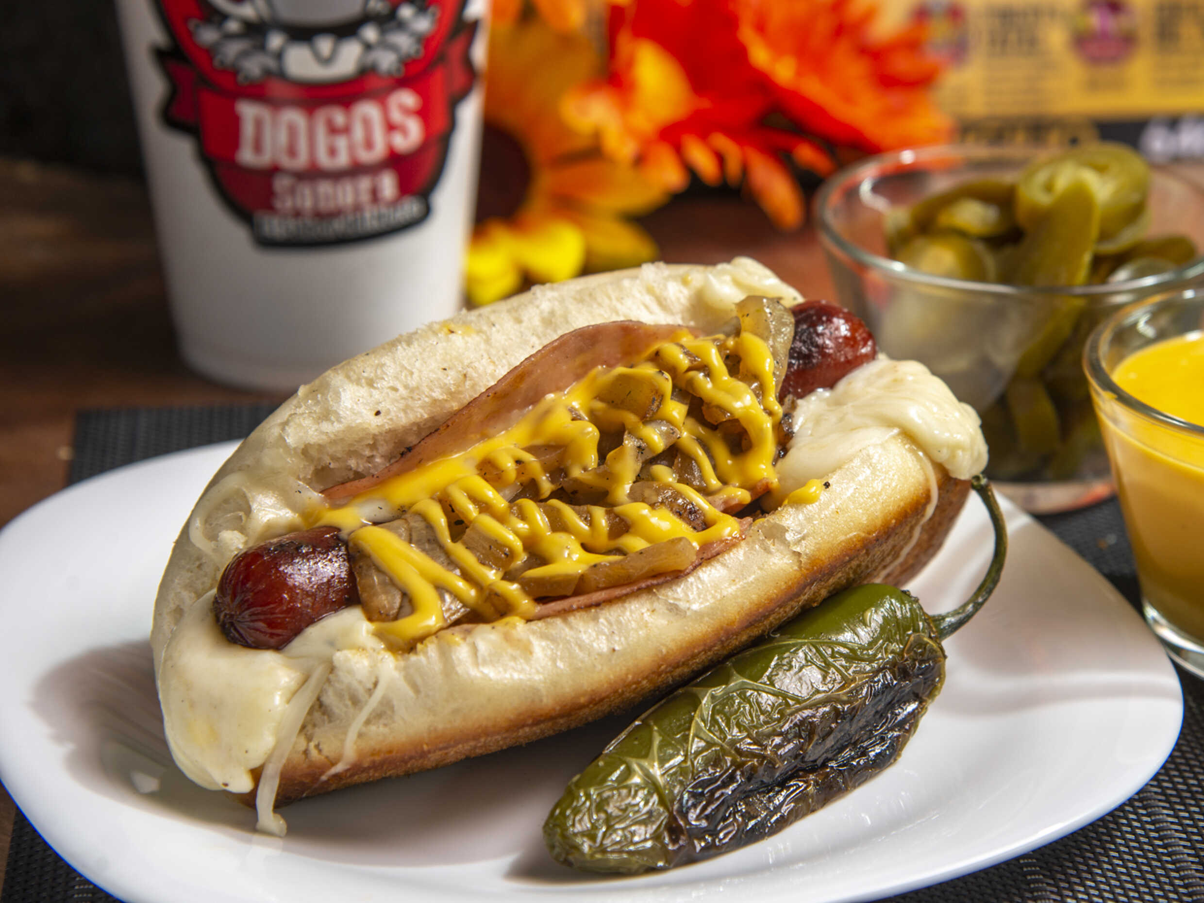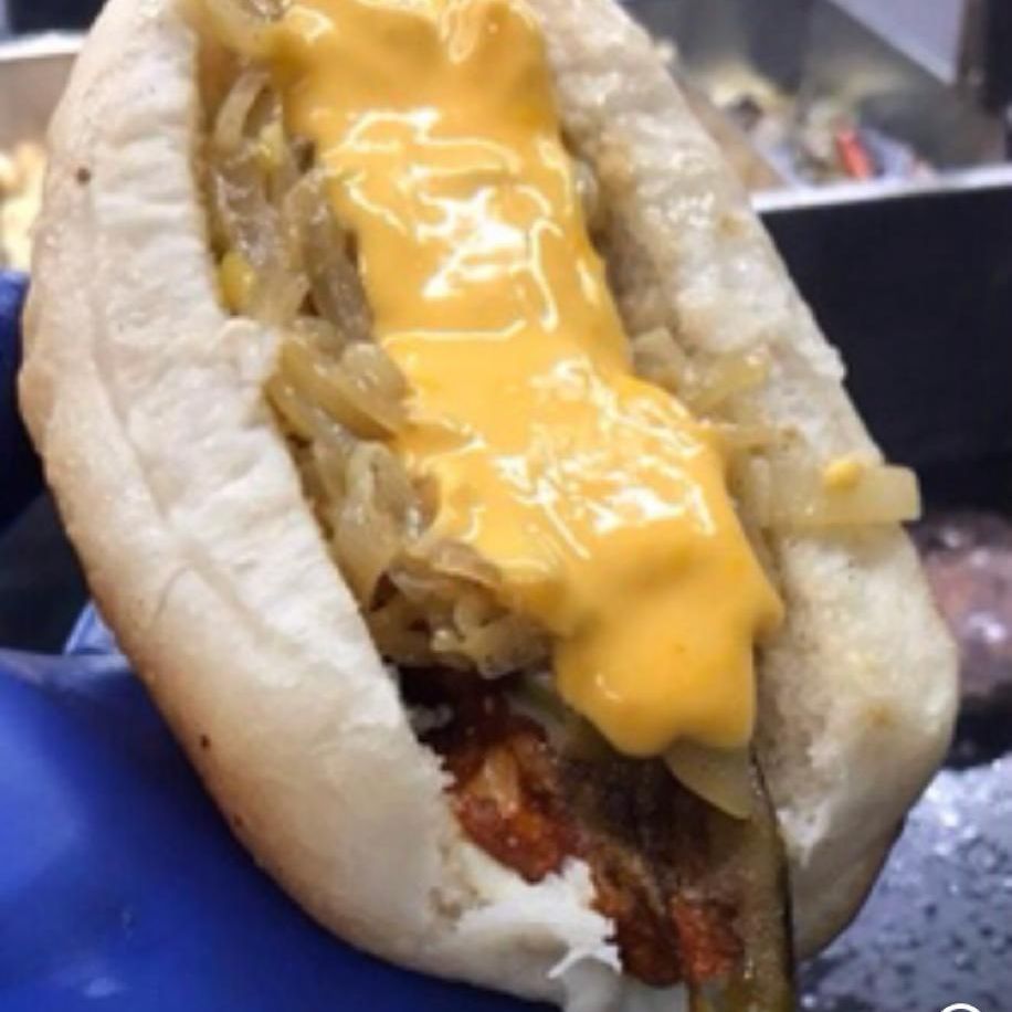 Salchicha con tocino, jamón, queso mozzarella, chile california asado, frijoles refritos, cebolla frita, queso de nachos.