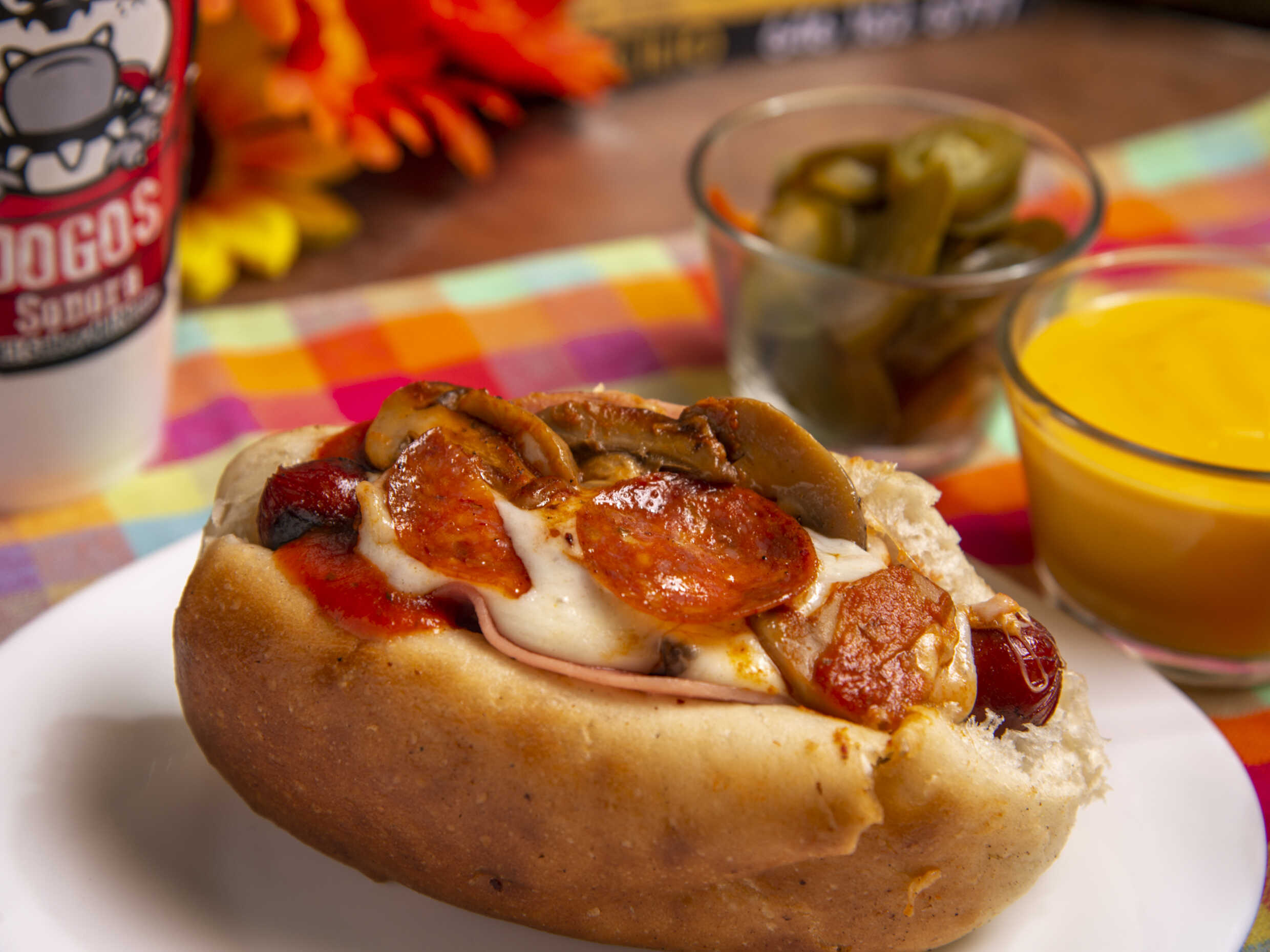 Salchicha con tocino, queso mozzarella, jamón, pepperoni, chorizo, frijoles refritos, cebolla frita, queso de nachos.