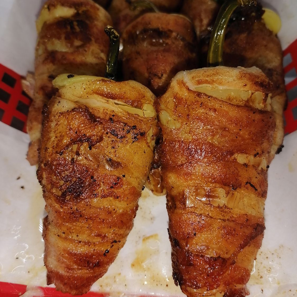 Chile güerito relleno de queso Philadelphia, jamón y queso mozzarella enrollado con tocino.