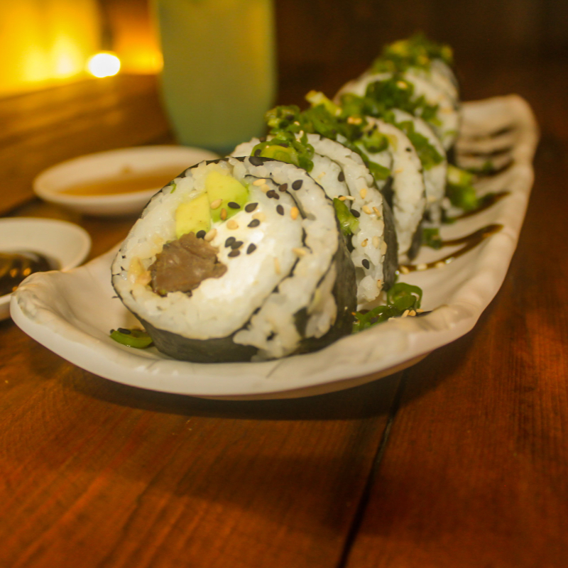 por dentro camaron, aguacate y res. por fuera: cuadritos de pollo cebollìn y ajonjolì