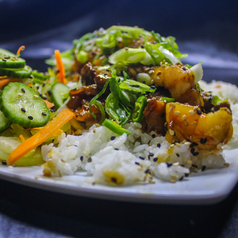 Camaròn, res, pollo chile serrano, cebollìn, ajonjolì, tare de la casa, ensalada de pepinillo y la cama de arroz
