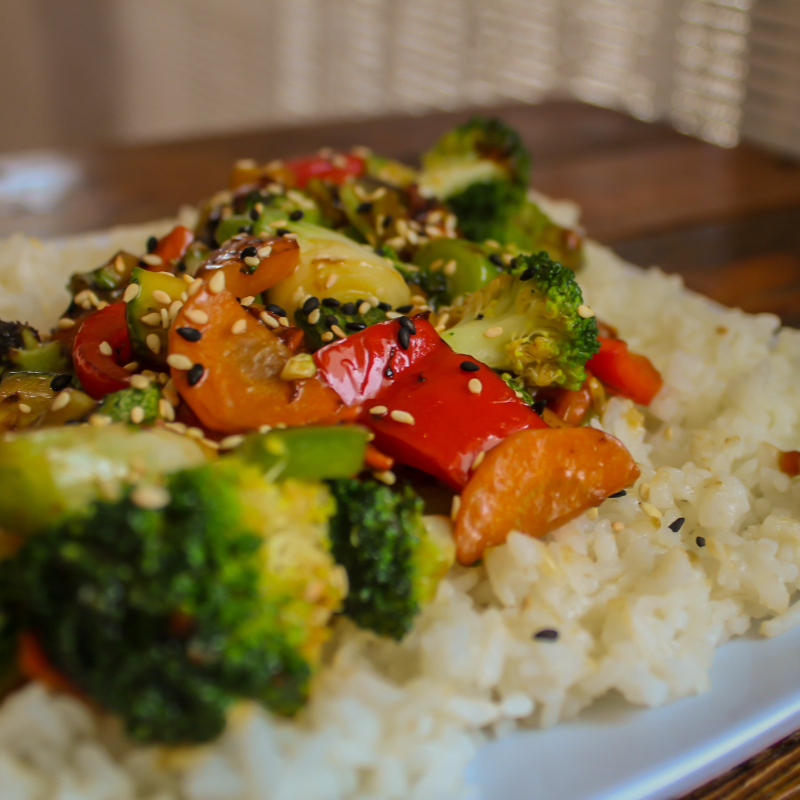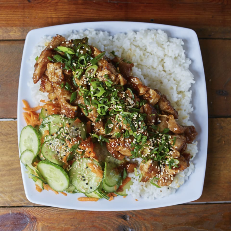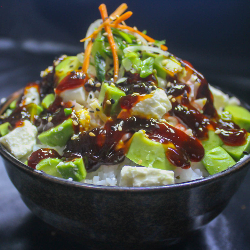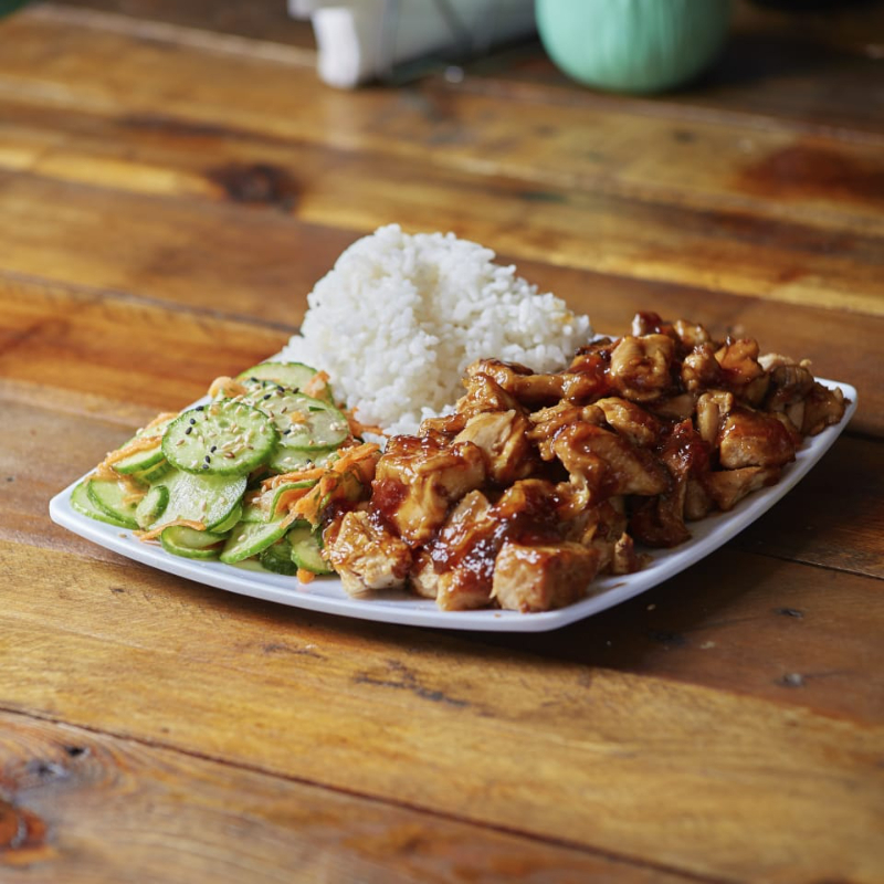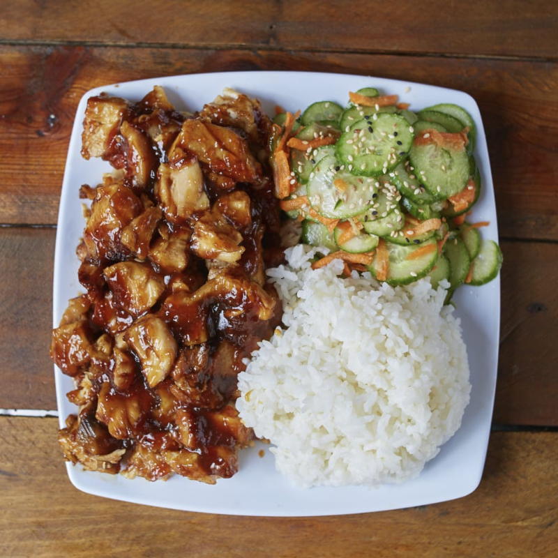 Pollo, brocoli, pimientos de colores, calabaza, zanahoria bañados en salsa tare, base de arroz blanco y ajonjolì