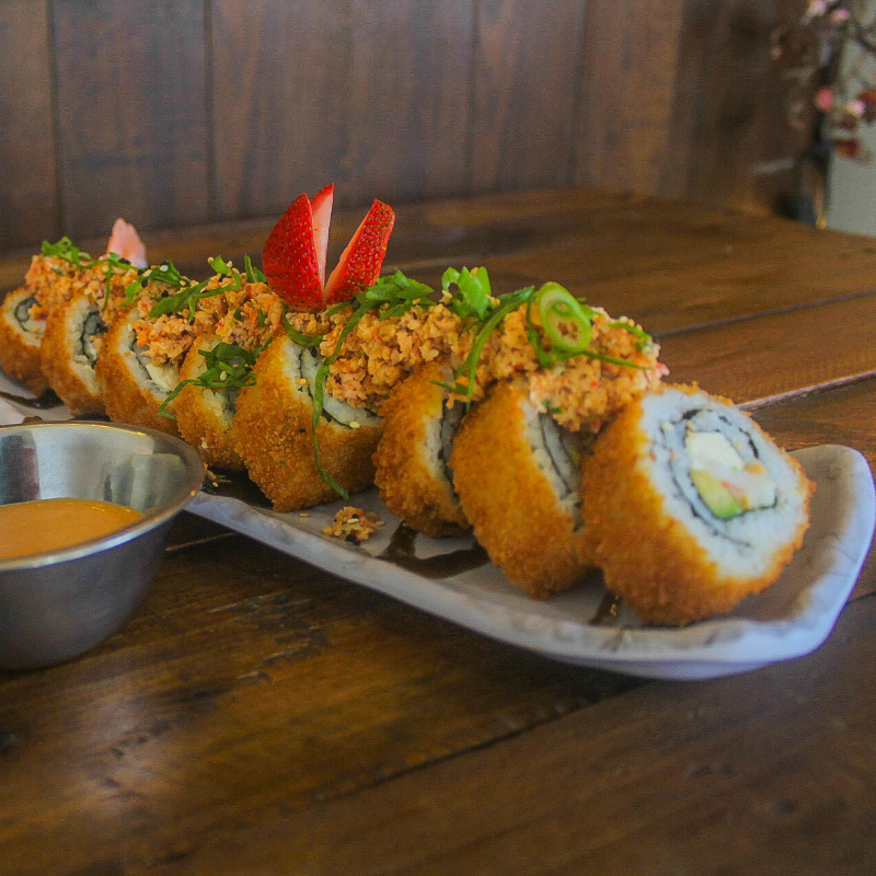 Por dentro: camaròn, aguacate y queso crema por fuera: va empanizado con toping de tampico, cebollìn y ajonjolì