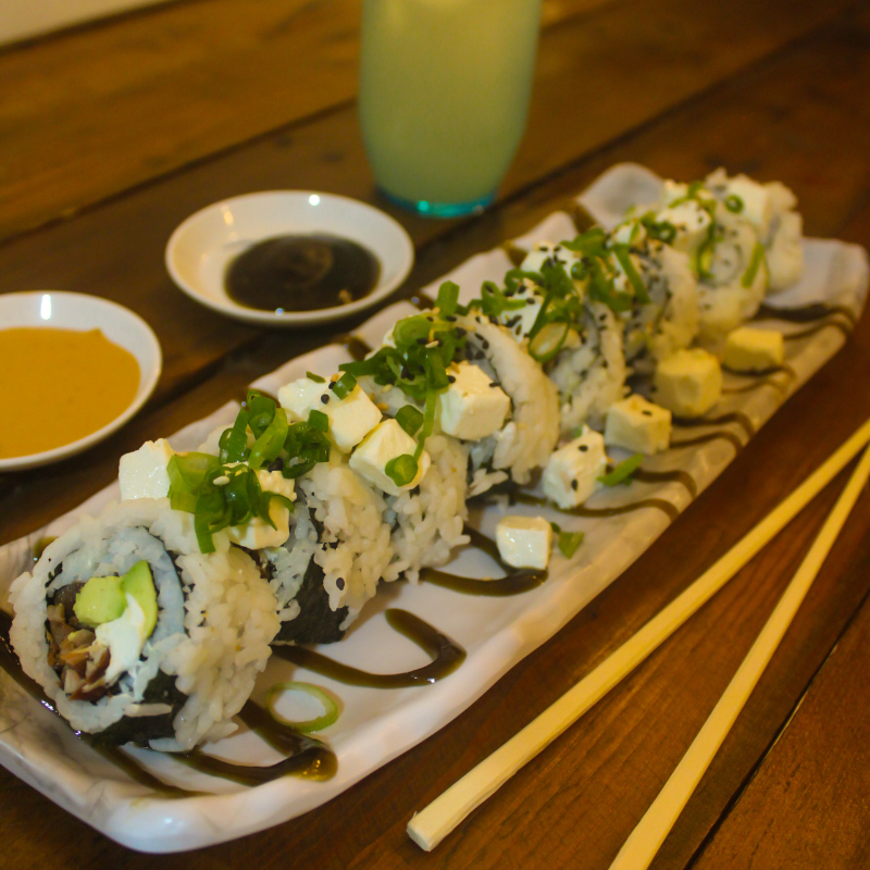 por dentro: surimi, pepino y aguacate por fujera tampico cebollìn y ajonjolì
