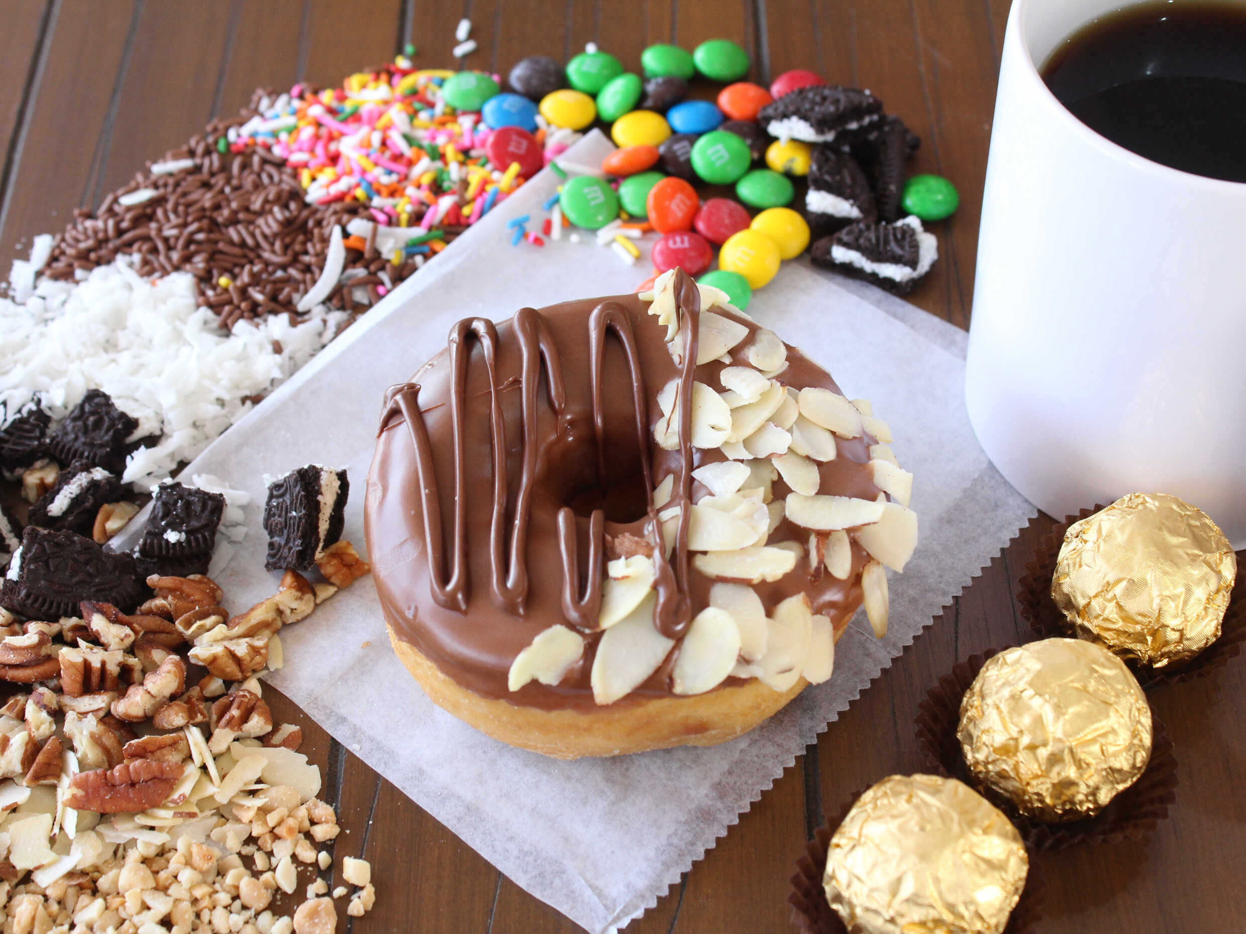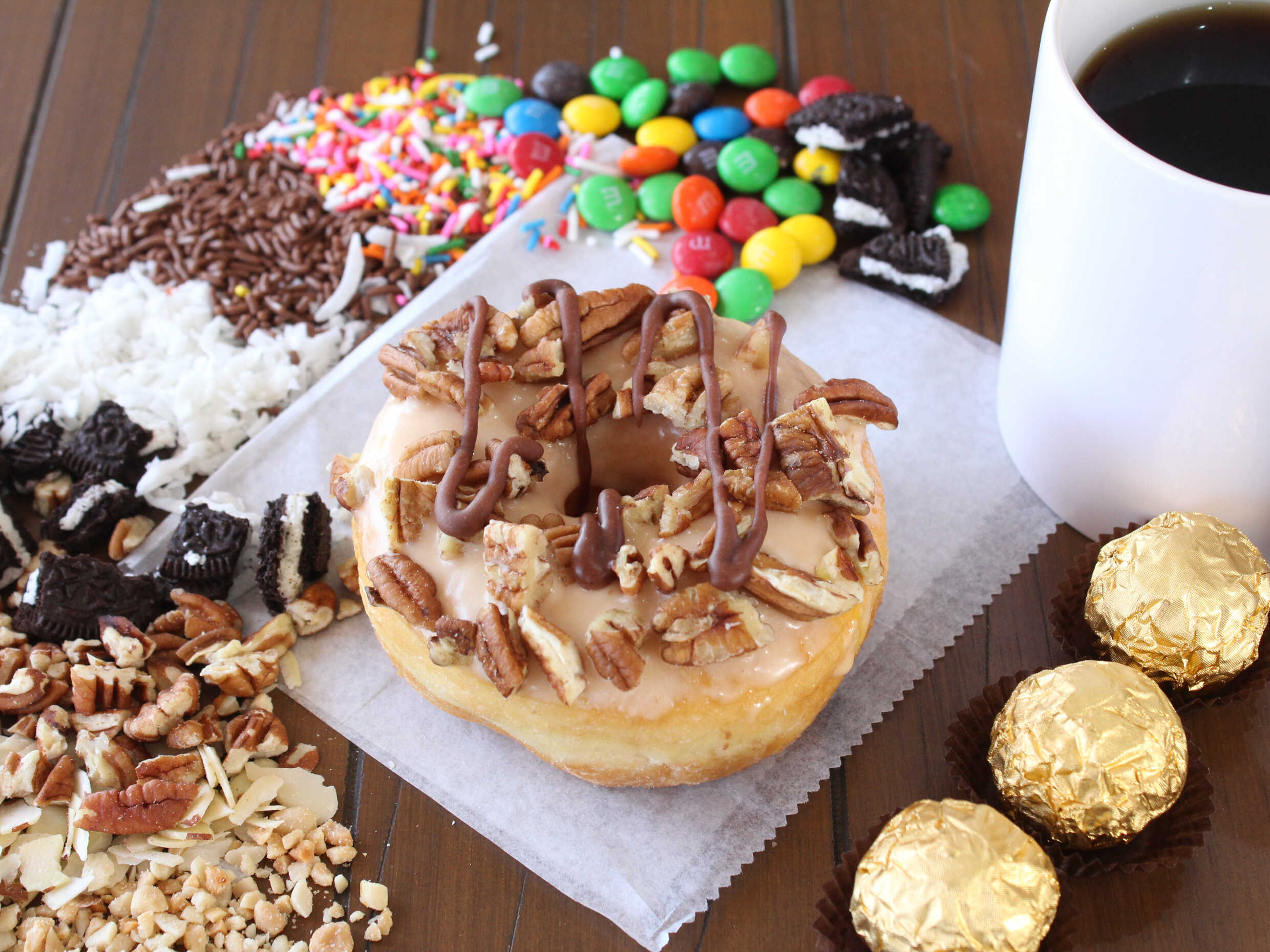 Dona cubierta de chocolate, cacahuate tostado, crema de avellana y chocolate Ferrero Rocher
