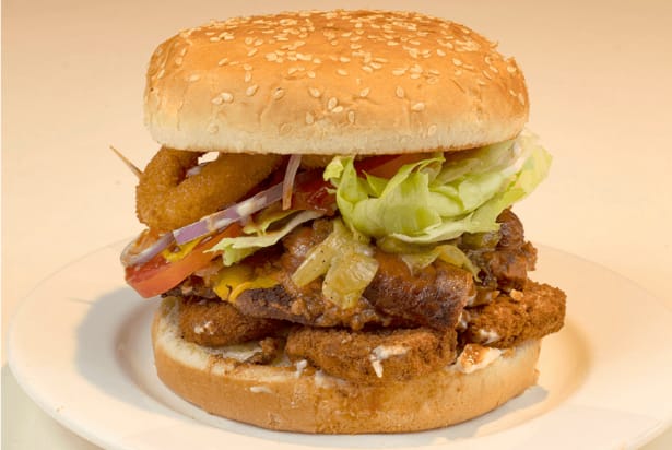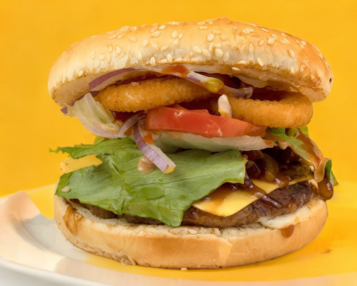 Carne 100% de res, receta de la casa, queso amarillo, tocino, aros de cebolla, lechuga, tomate, cebolla, ketchup, mostaza, mayonesa y papas