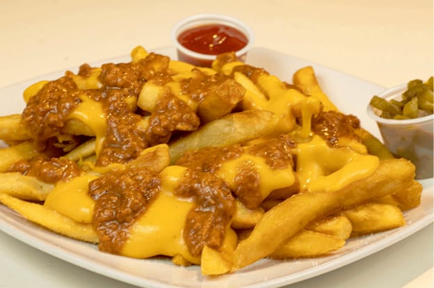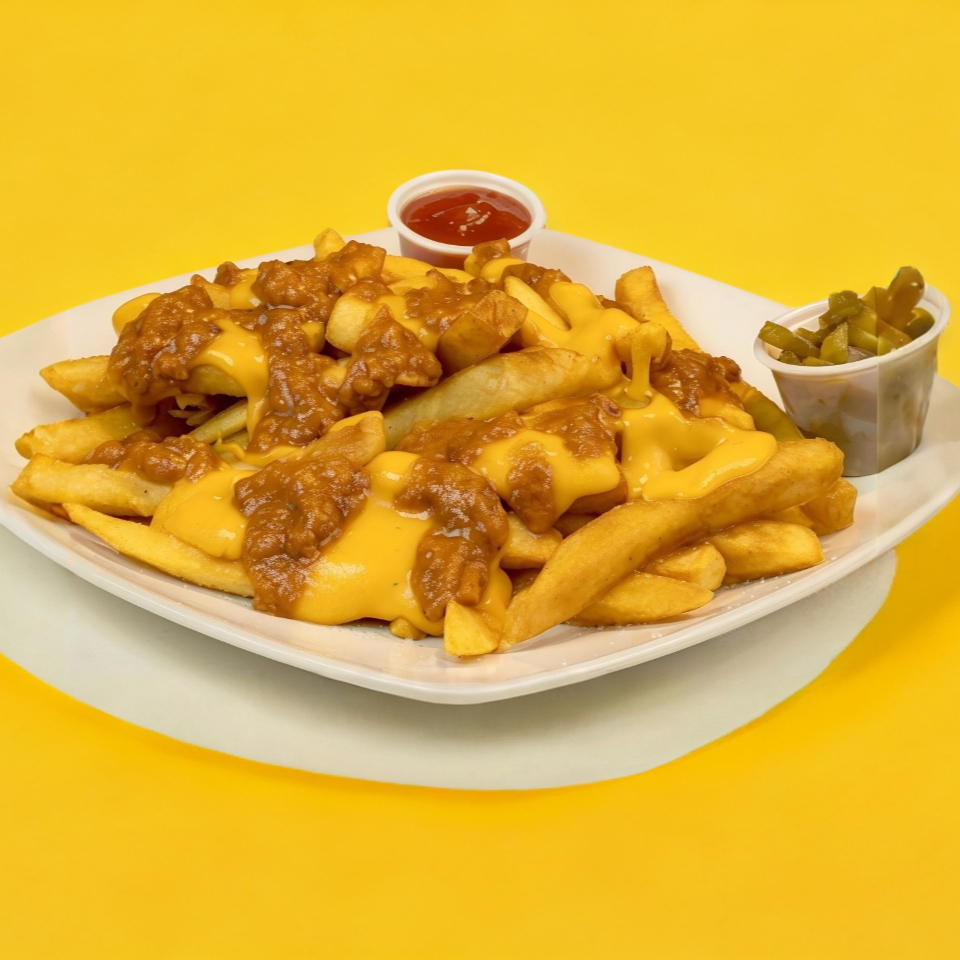 Carne 100% de res, receta de la casa, con salchicha, chilli beans, cebolla asada, nuggets y aros de cebolla.