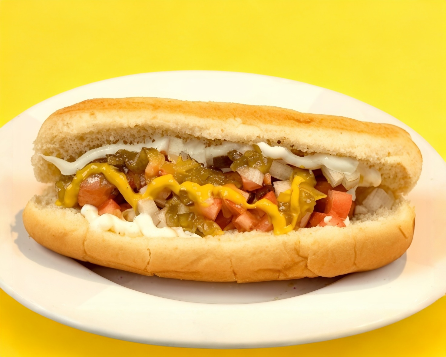 Carne 100% de Carne 100% de res, receta de la casa, queso amarillo, chilli beans, salchicha, cebolla asada, lechuga, tomate, cebolla, ketchup, mostaza, mayonea y papas