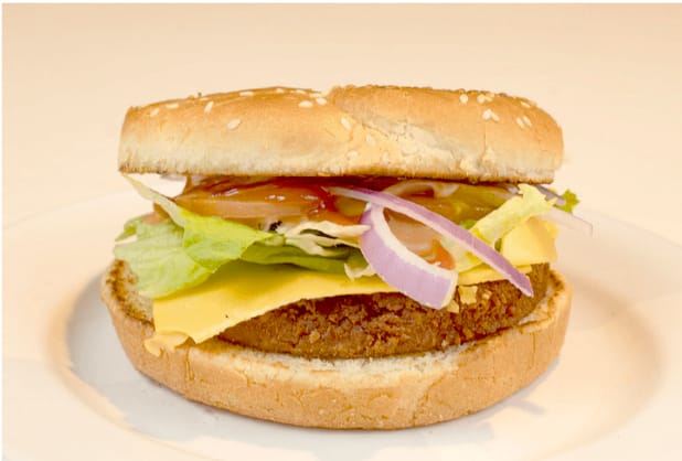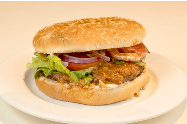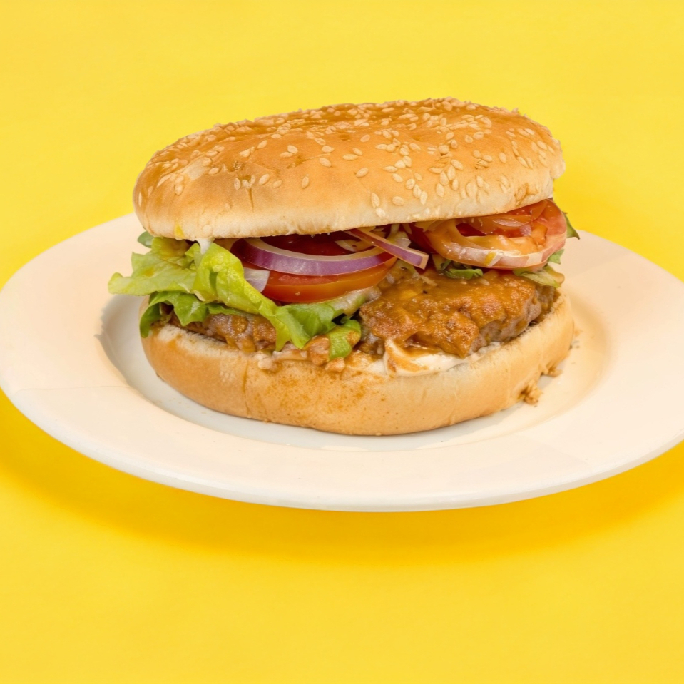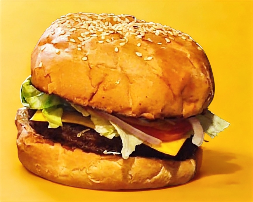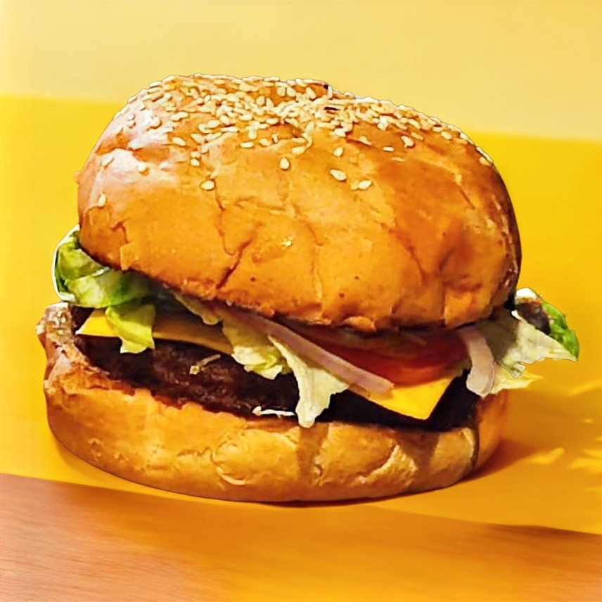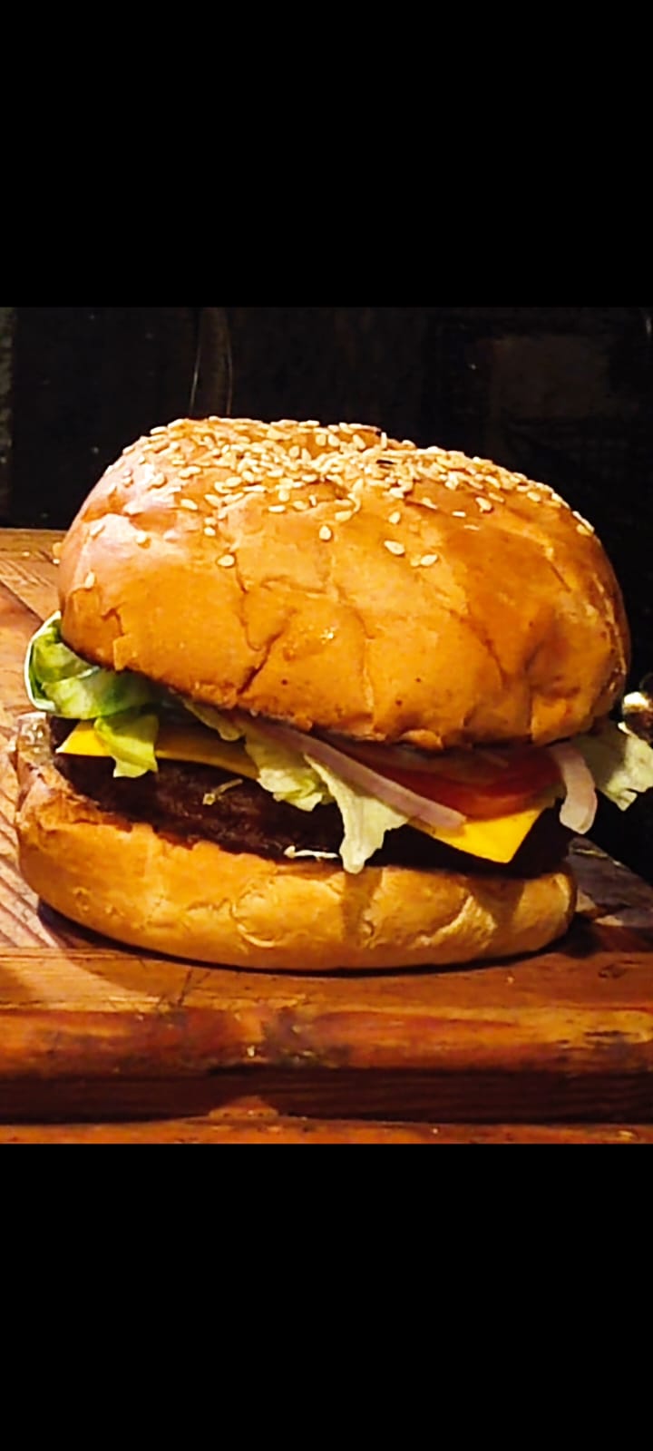 Hamburguesa carne 100% de res, receta de la casa, con queso amarillo.
