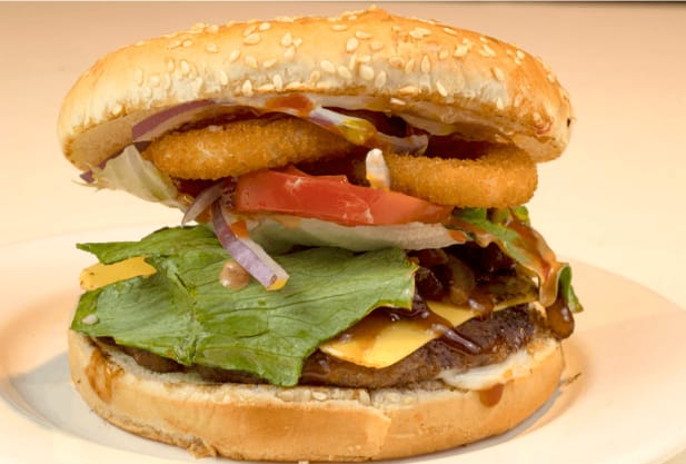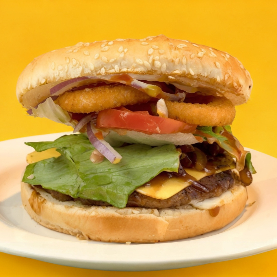 Carne 100% de res, receta de la casa, BBQ, tocino y aros de cebolla.