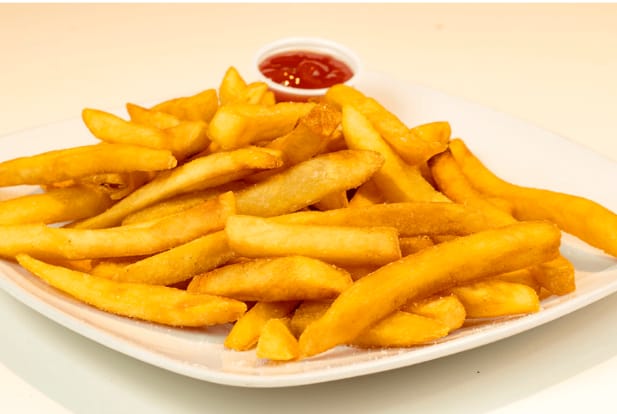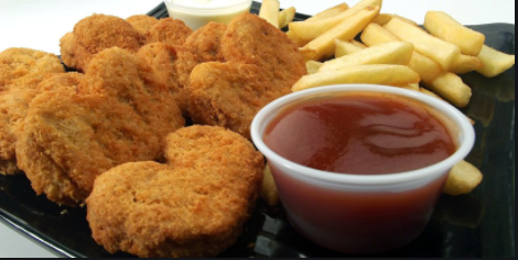 10 piezas de nuggets de pollo acompañados con papas fritas