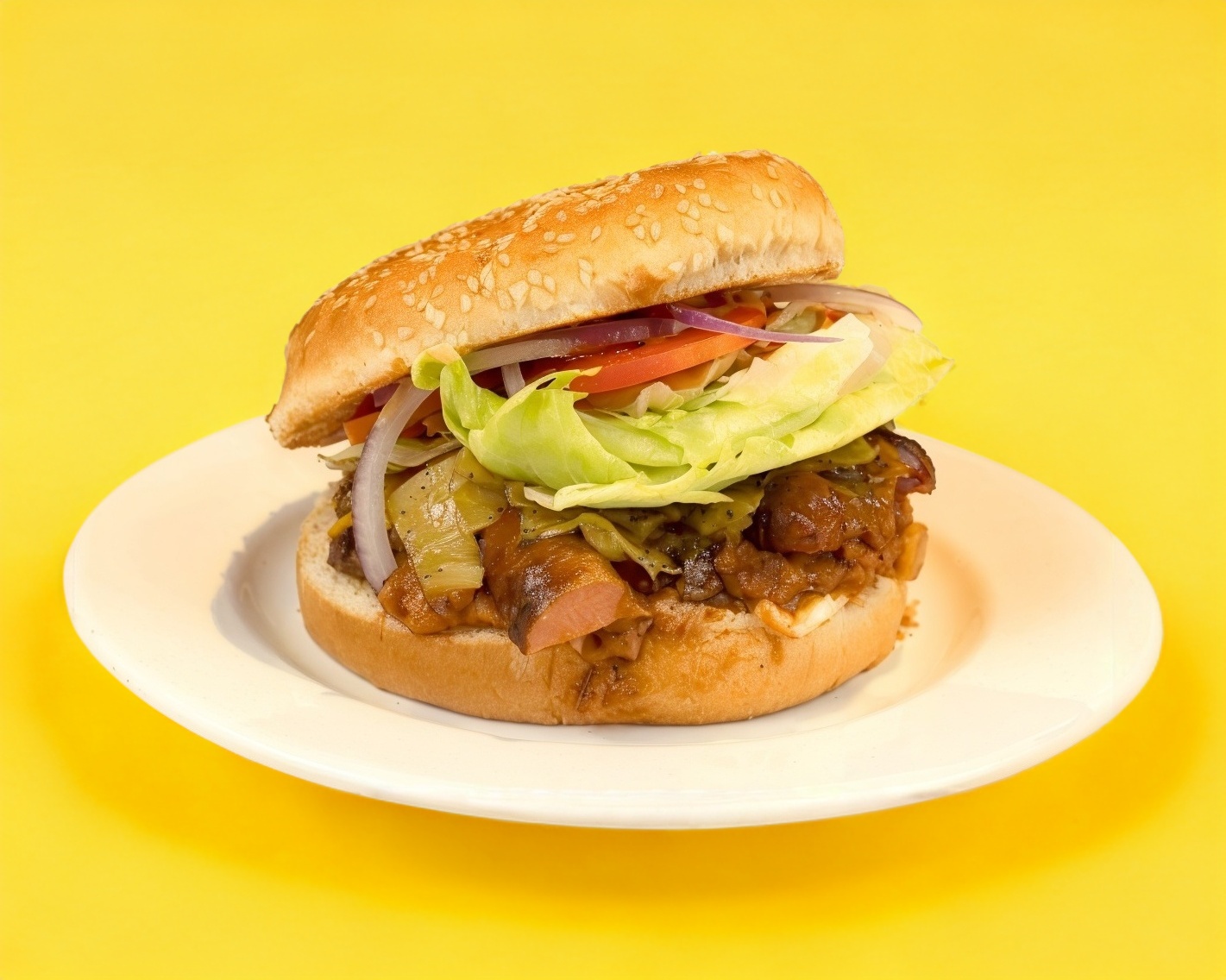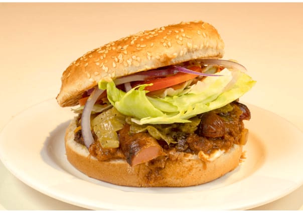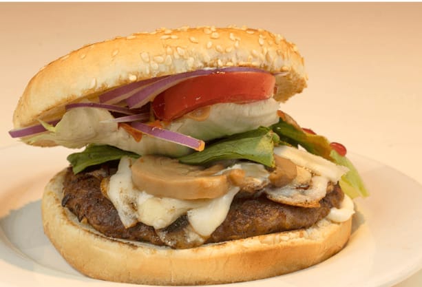 Carne 100% de res, receta de la casa, queso oaxaca, champiñones, lechuga, tomate, cebolla, ketchup, mostaza, mayonea y papas