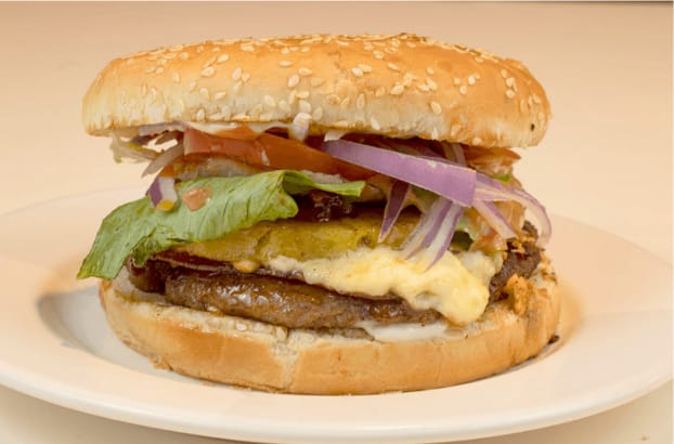 Carne 100% de res, receta de la casa con jamón, piña y BBQ.