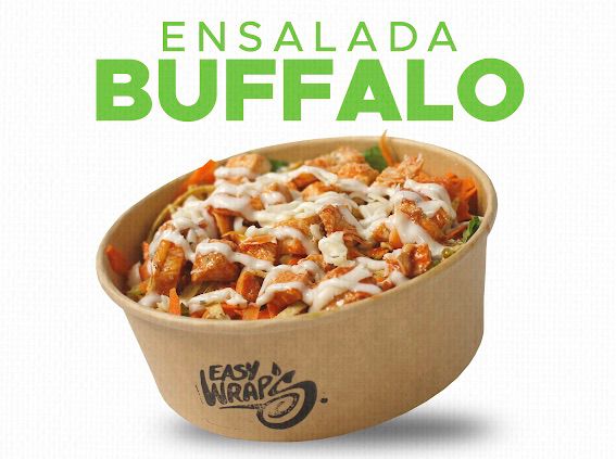Pollo empanizado en salsa búfalo, lechuga romana, zanahoria, mozarela, tiritas de tortilla y aderezo ranch.