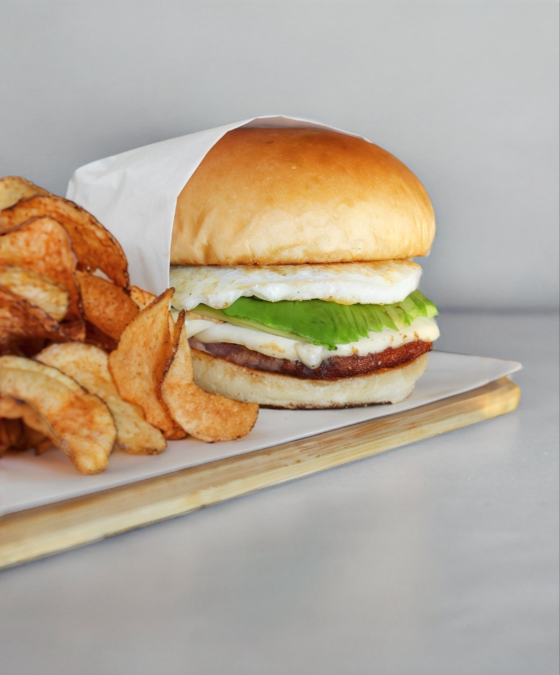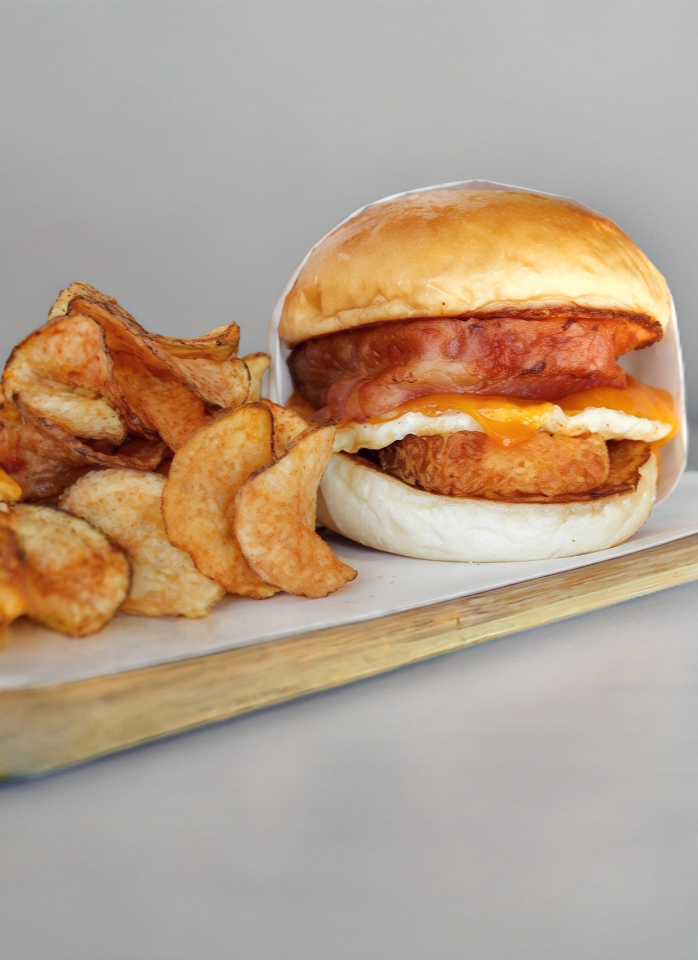 1 Huevo, papa hash brown, tocino ahumado y queso cheddar. Con pan tipo brioche y huevos estrellados. Incluye papas corte chips.